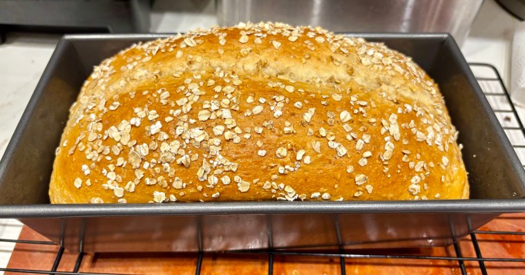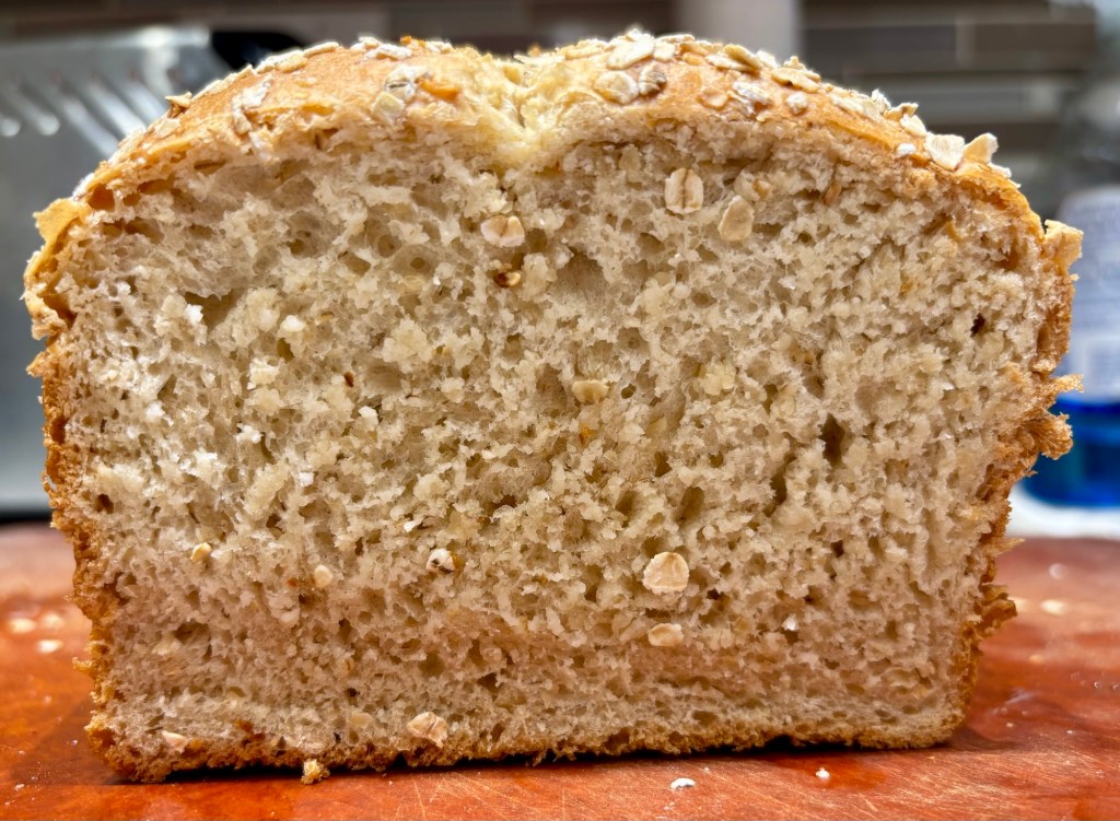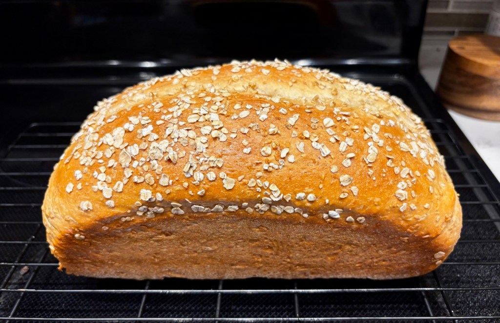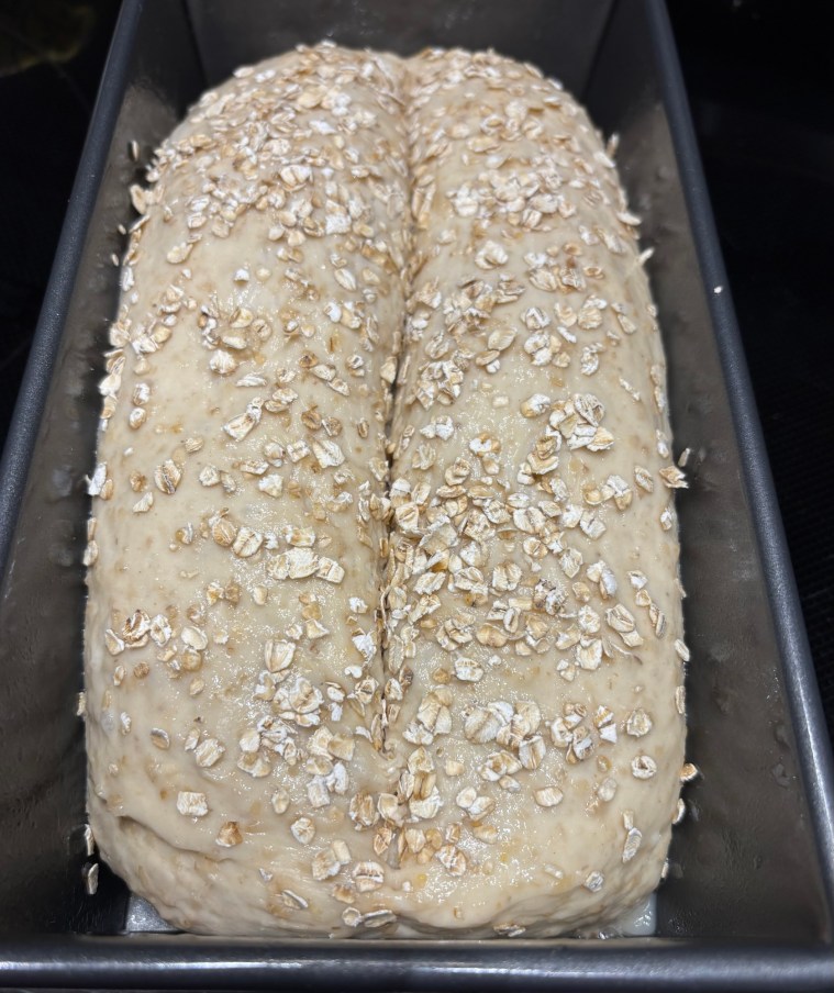 Brush the top of the loaf with the mixture and sprinkle a handful of oats over the top. Split the top lengthwise with a bread knife.