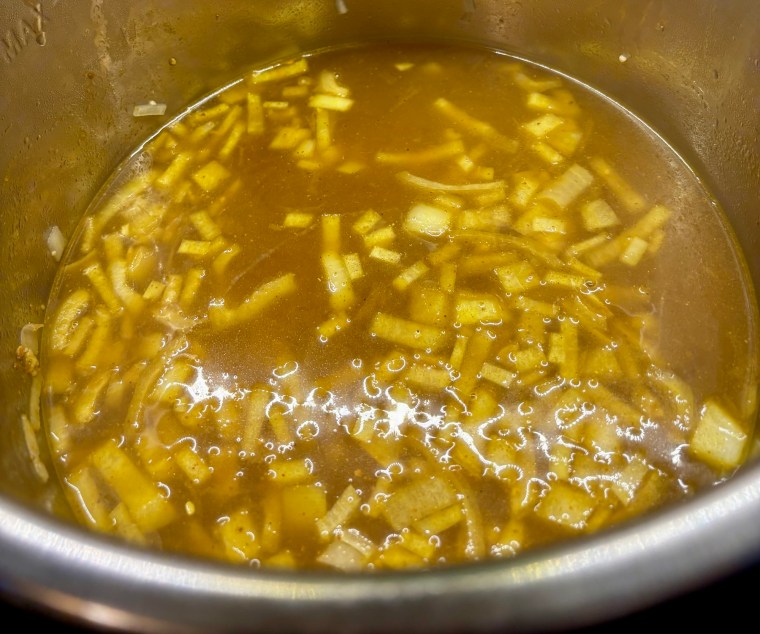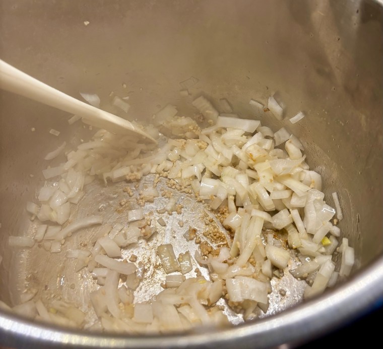 Click “saute” on your Instant Pot, add the oil, and saute until onions are transluscent: