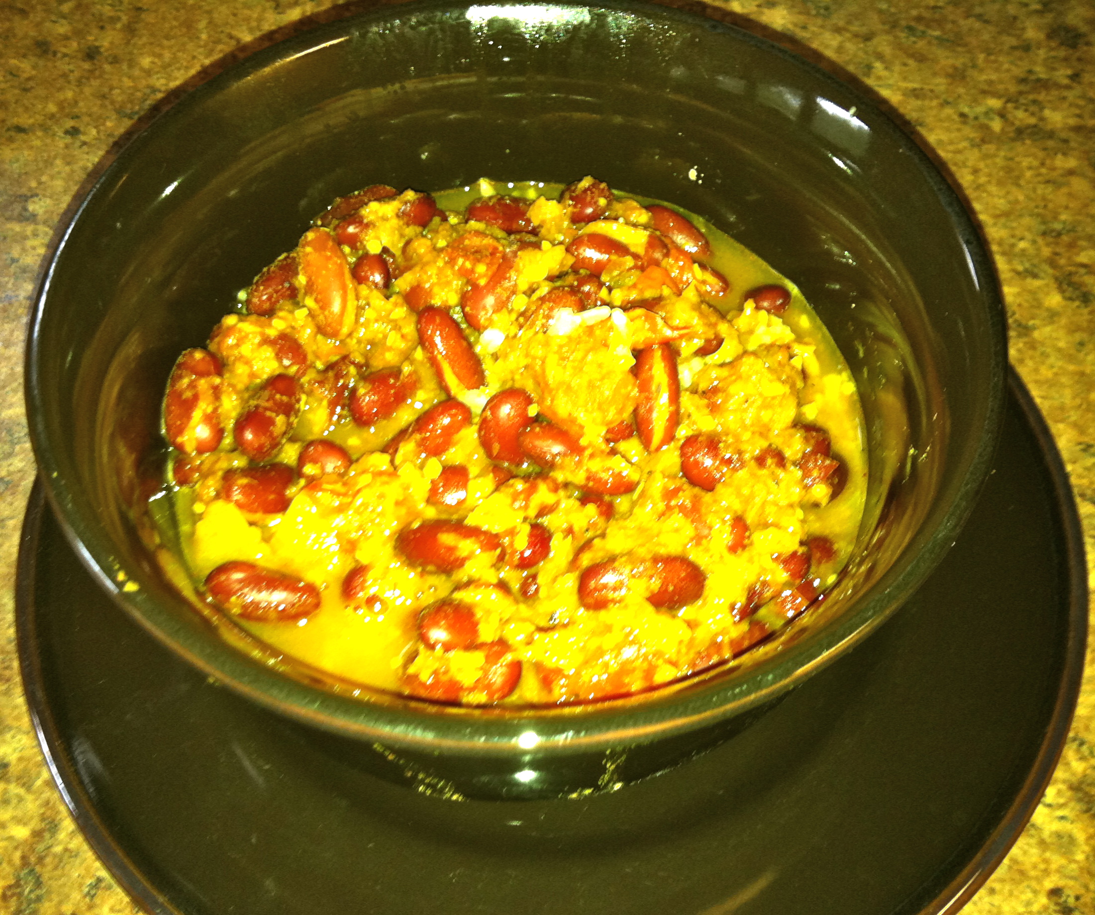 Here’s my version of Vij’s Rajma Chawal–the only changes I really made were to reduce the oil from half a cup to a spray of the pan and to use canned tomatoes, rather than fresh ones (but only because I’d run out of fresh ones). I also reduced the salt to 1/3 of the original.