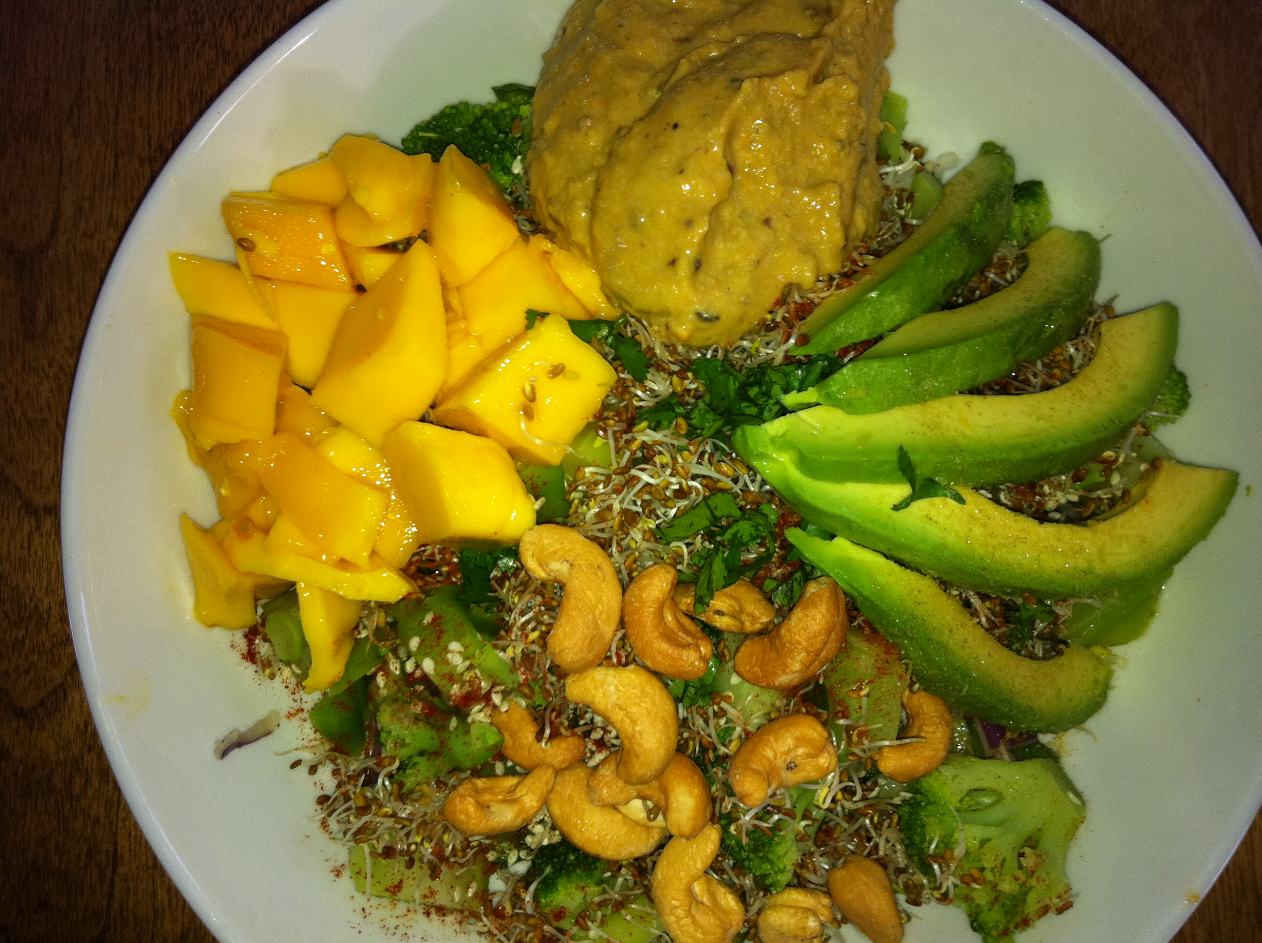 On top of the salad in one quadrant place 1/4 of a sliced avocado, in the second quadrant place 1/2 a mango sliced, in the third quadrant place a couple of TBS red-pepper & olive hummus, and in the last quadrant a small handful of cashews.