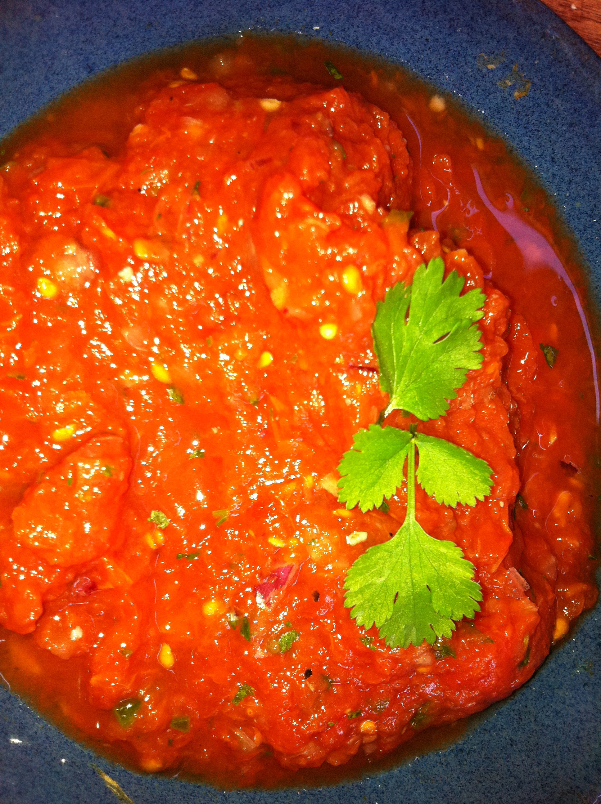 Now, the One-Minute Salsa is truly amazing: you won’t believe something that takes a minute can taste this good–so fresh! My sister has been making this for years. The original recipe is from Cooks Illustrated, but she just uses canned tomatoes, so I did too…which makes it even quicker. The original recipe calls for one jalapeno pepper, but I use a serrano pepper because it’s got a bit more of a bite to it: