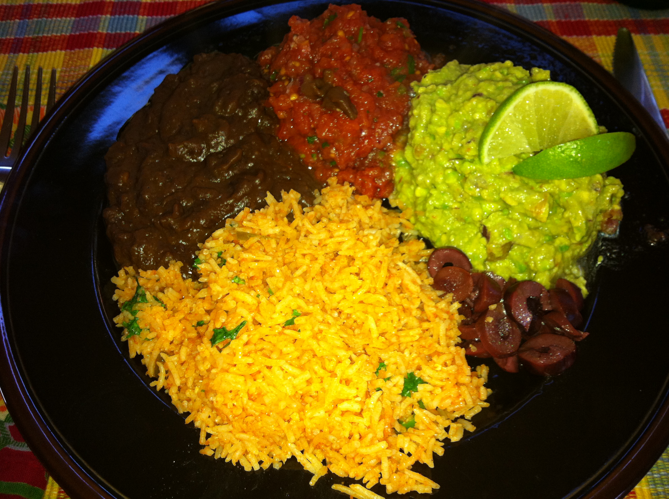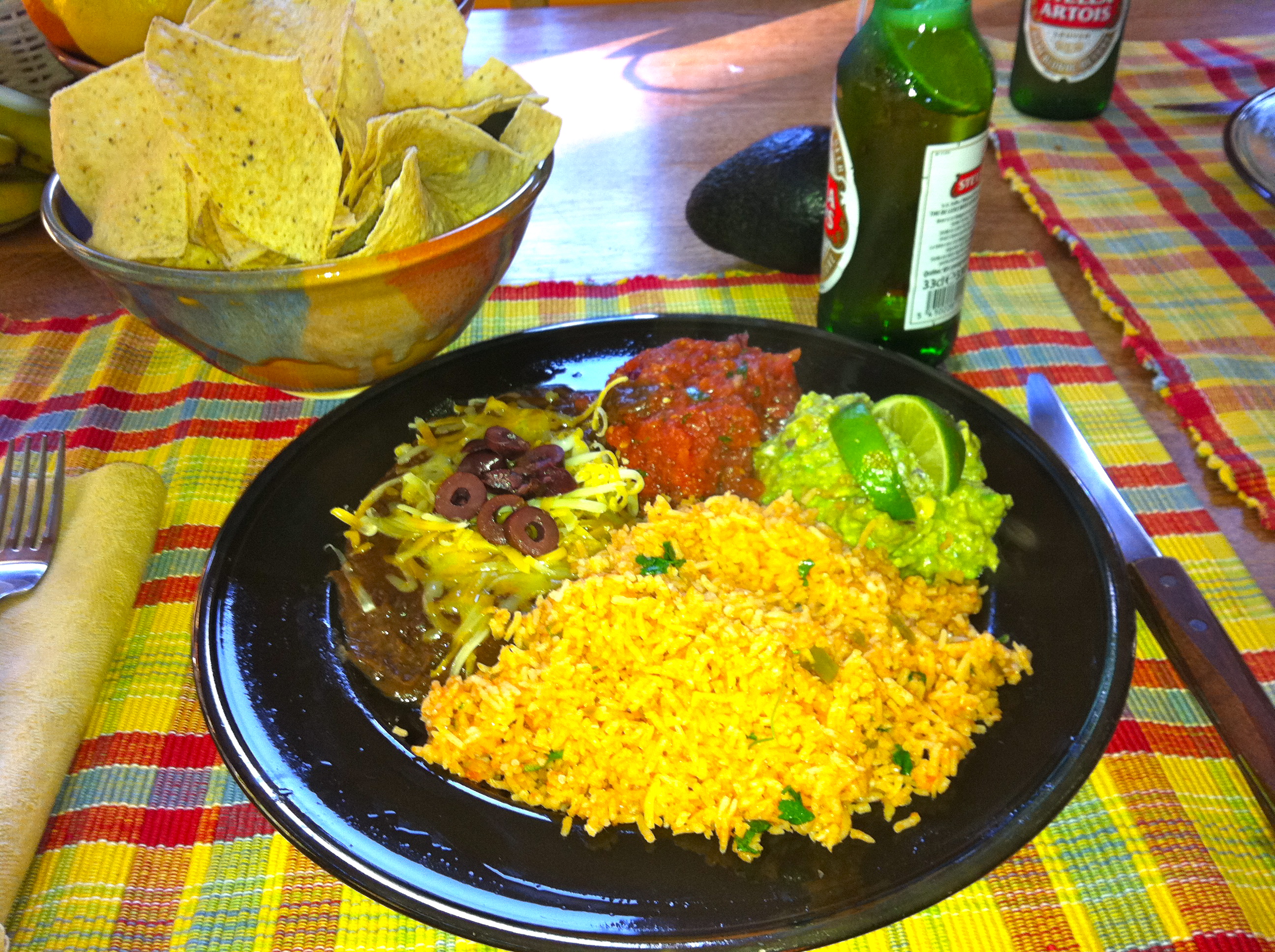 Mine’s the same, but without cheese: refried black beans, salsa, guacamole, Mexican rice, and black olives. It’s really just another version of “the bowl”: a bean, a green, a grain, and a sauce. I was hoping that we had some Coronas or Dos Equis to go with our feast, but alas, we had to make do with a couple of bottles of Stella…though we did drink it with lime, so it seemed like Mexican beer.