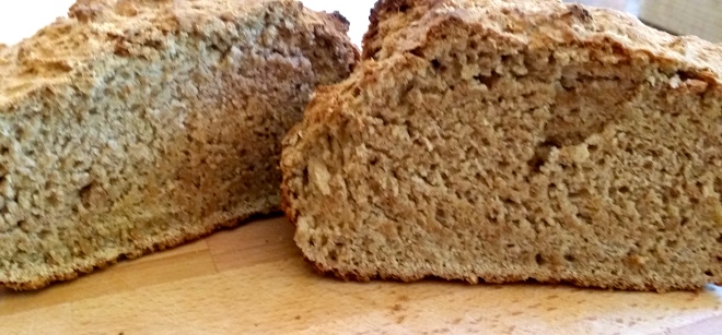In an attempt to make a healthier beer bread (i.e., a lower proportion of white flour), I spent the morning browsing recipes and came up with this one. The crust is lovely–super crunchy!