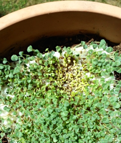 I’ll admit it looks rather strange, but that’s because when I first tried to sprout my chia seeds, I used my sprouter and they turned into a gelatinous mess. I should’ve researched first. Next, I tried them on hunks of damp gauze, which worked brilliantly…except that apparently, they are microgreens, not sprouts, so they actually take hold of whatever you’re sprouting them on. The chia sprouts shot down roots right through the gauze! I figured I’d just try planting them in a pot of earth…gauze and all. We’ll see what happens. Apparently, with microgreens, you trim them off at the root to use them (as opposed to sprouts).