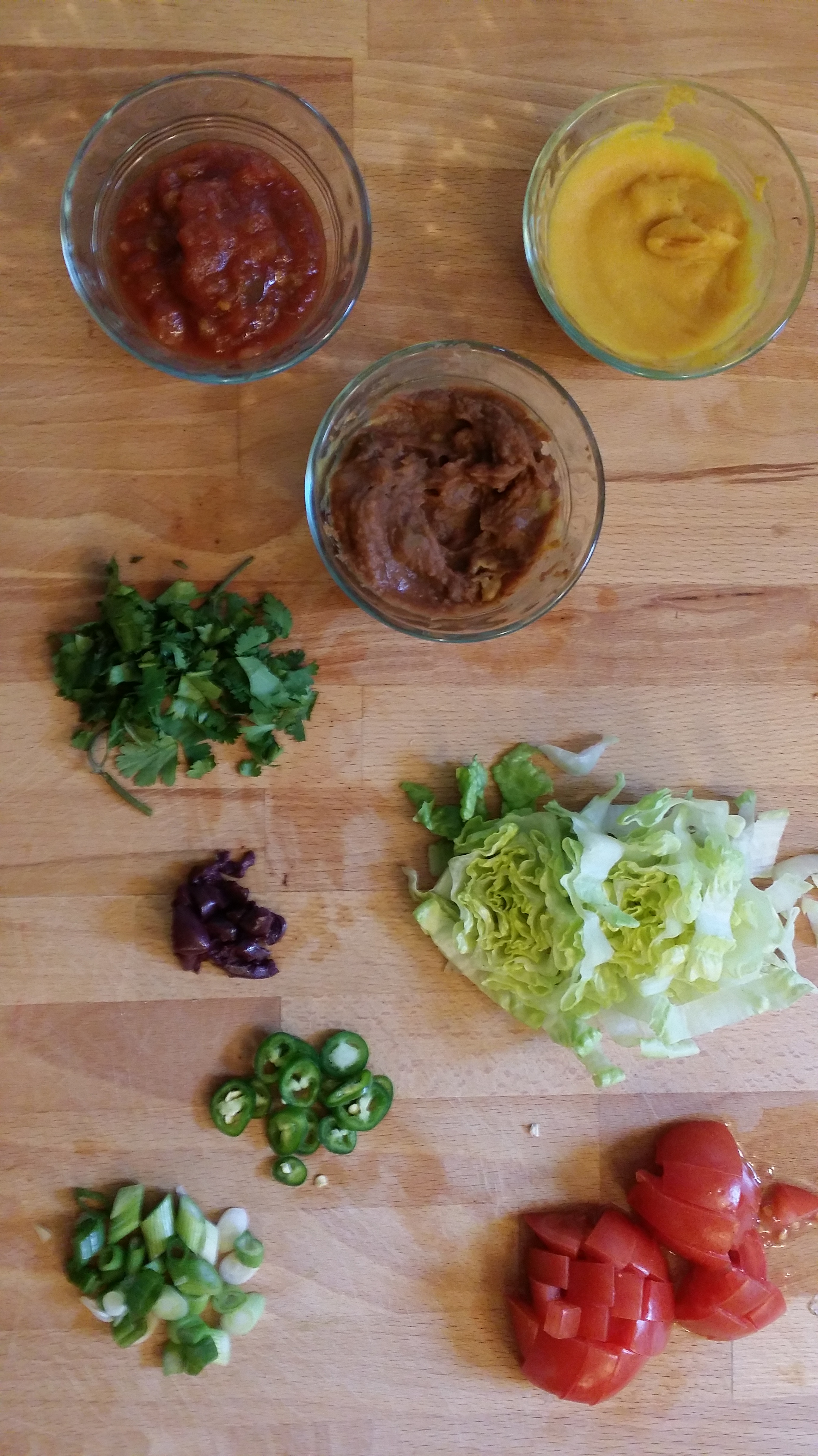 Salsa, Vegan “Cheese Sauce,” Refried Black Beans, Chopped Cilantro, Chopped Kalamata Olives, Sliced Serrano Peppers, Green Onions, Romaine Lettuce, Roma Tomatoes.