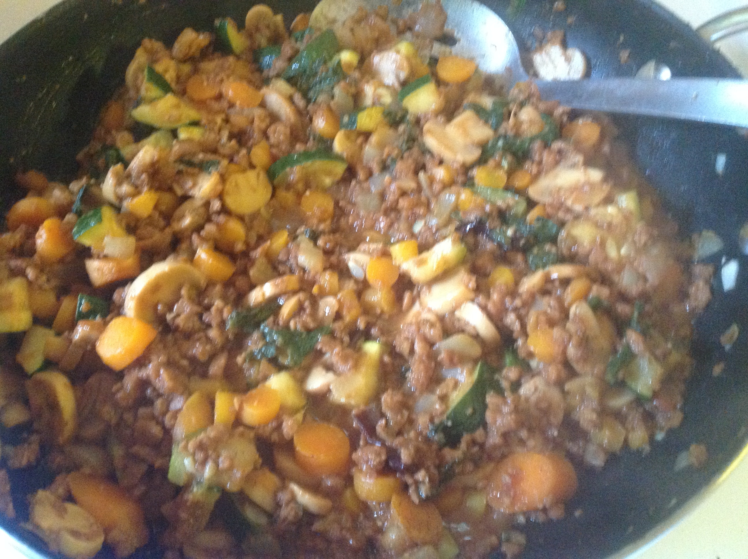 Spray a large skillet with cooking oil. Saute (on medium heat) onions, carrots, and garlic until tender for about 7 to 10 minutes, then add the zucchini, mushrooms, greens for a few more minutes. Once the vegetables have softened and start to brown a little add the tomato sauce and mix evenly. Add the meatless ground round and cook for a few more minutes. Add the vegan Worcestershire sauce, liquid smoke, and vegetable stock. Season with salt and pepper, to taste.