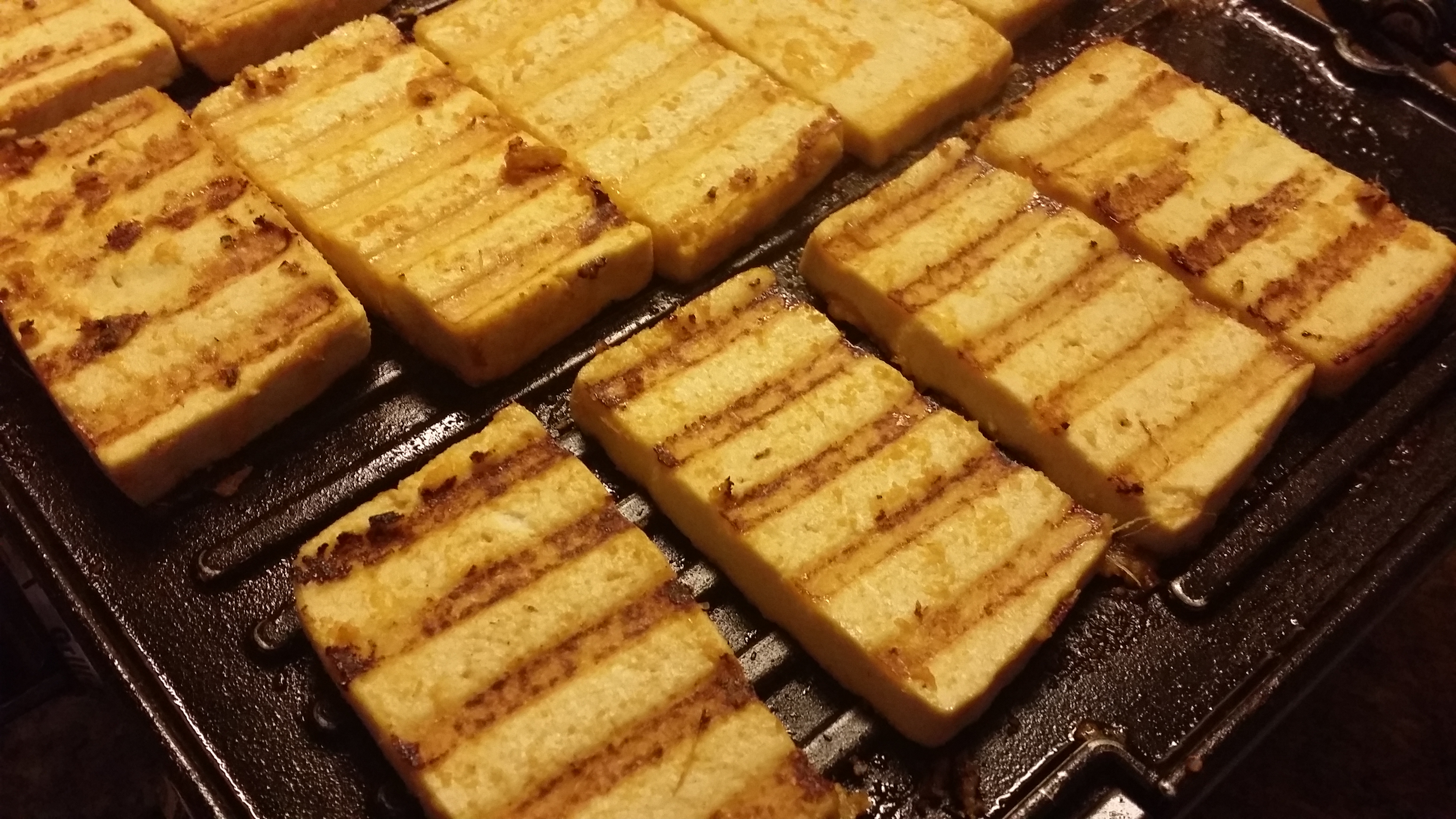 - Take tofu out of marinade (save) and arrange the planks on the the grill.