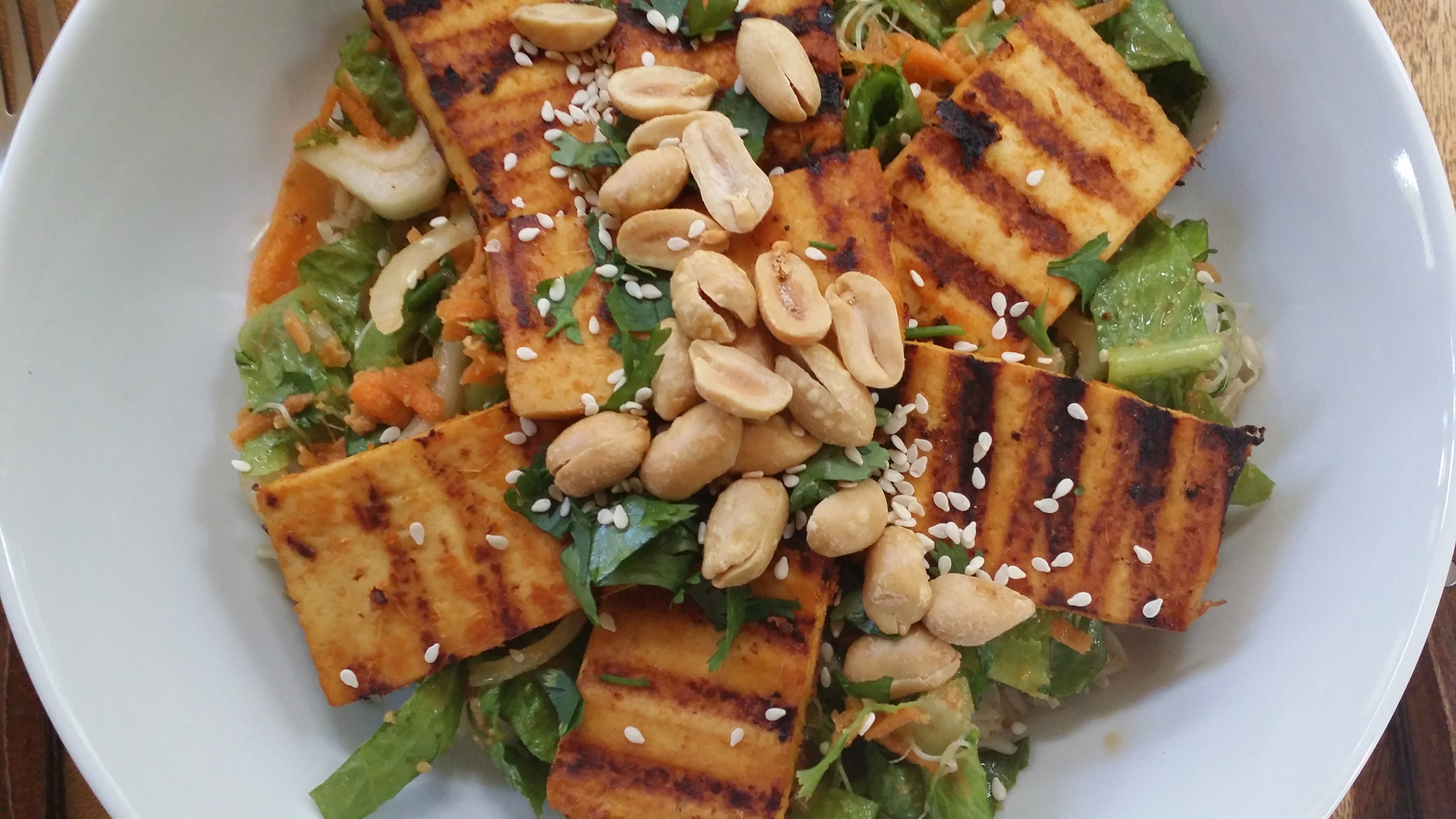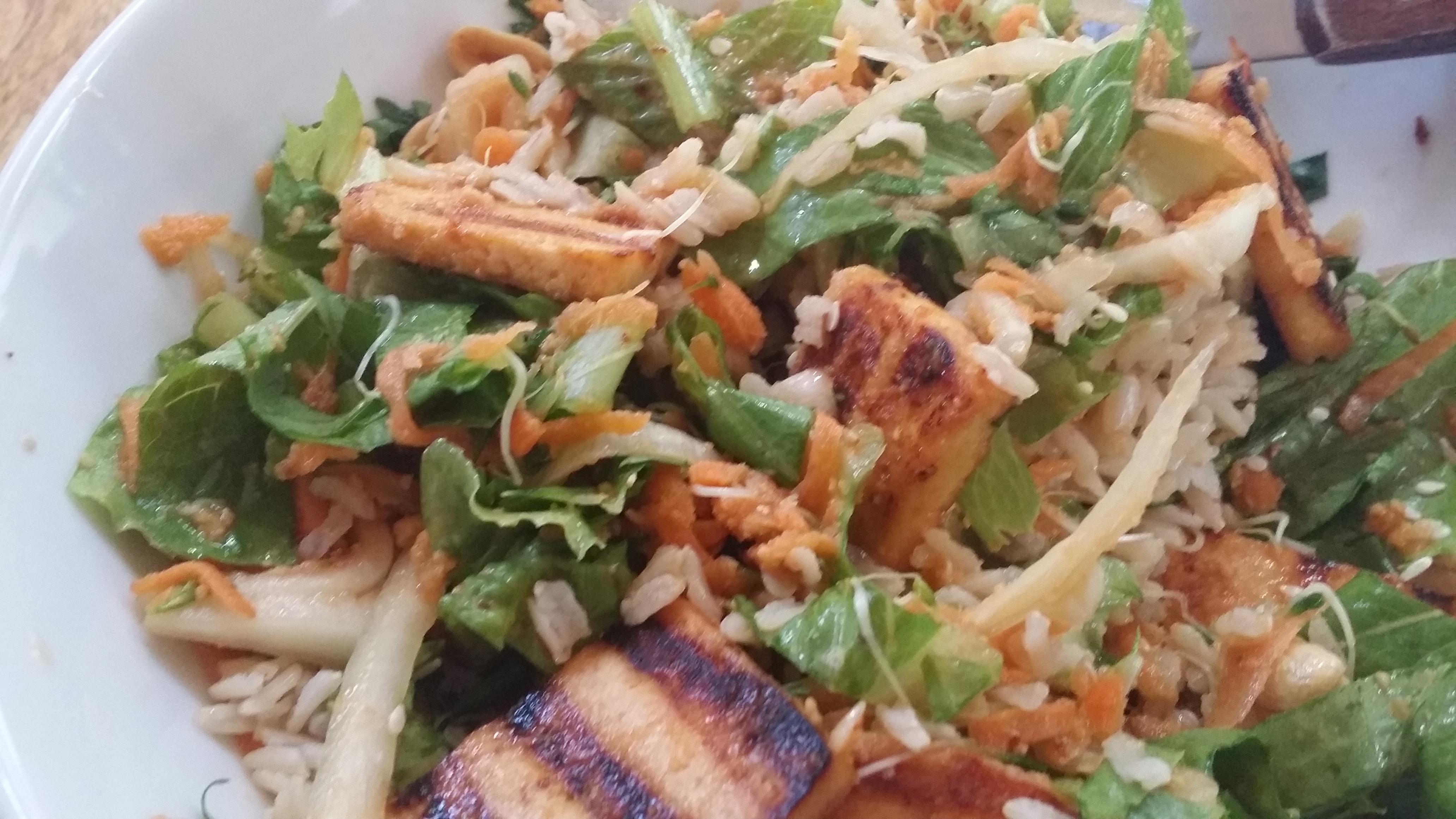 Grilled Ginger-Sesame Tofu (sprinkled with sesame seeds and cilantro) (your beans/seeds and a bit more sauce, which, as it turns out is complimentary to the Pad Thai Salad dressing!).