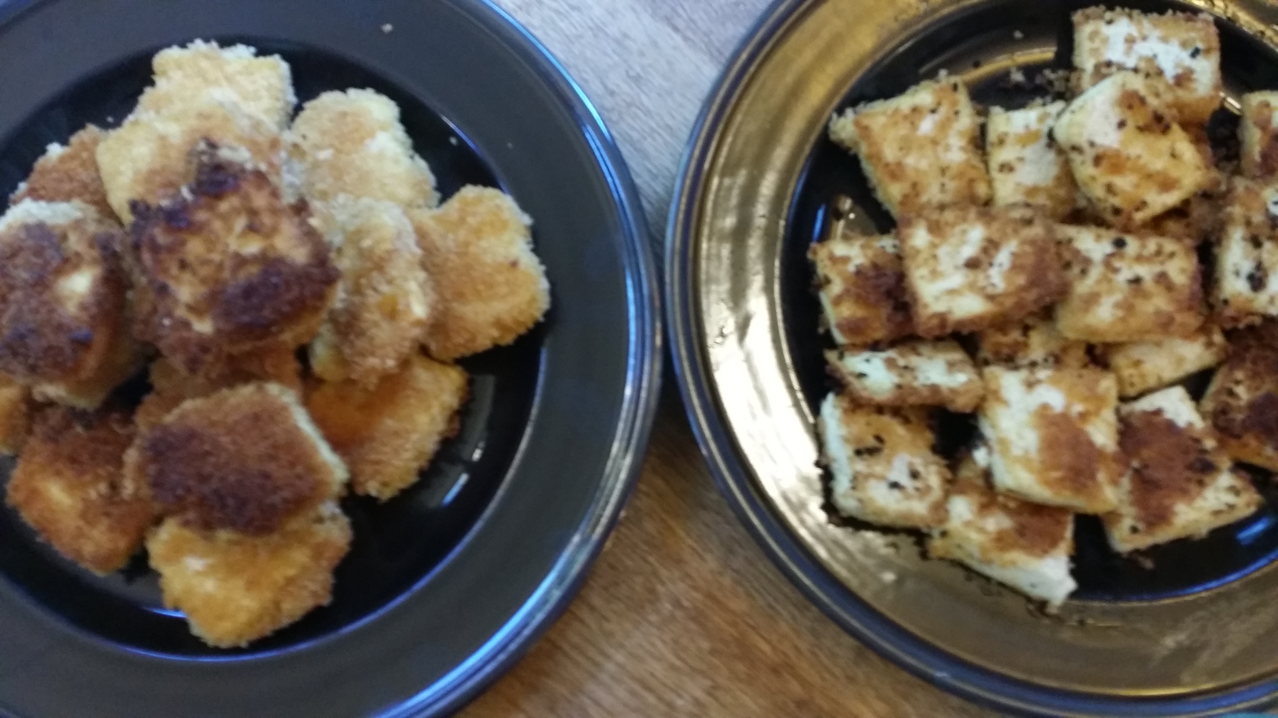 The end result was a batch of deep-fried, thickly battered tofu, which was quite good, but you can’t really eat more than one or two. The second platter in the picture below is the thinly battered batch, which I preferred. J preferred the thickly battered ones, however. Even so, we have quite a bit left over.