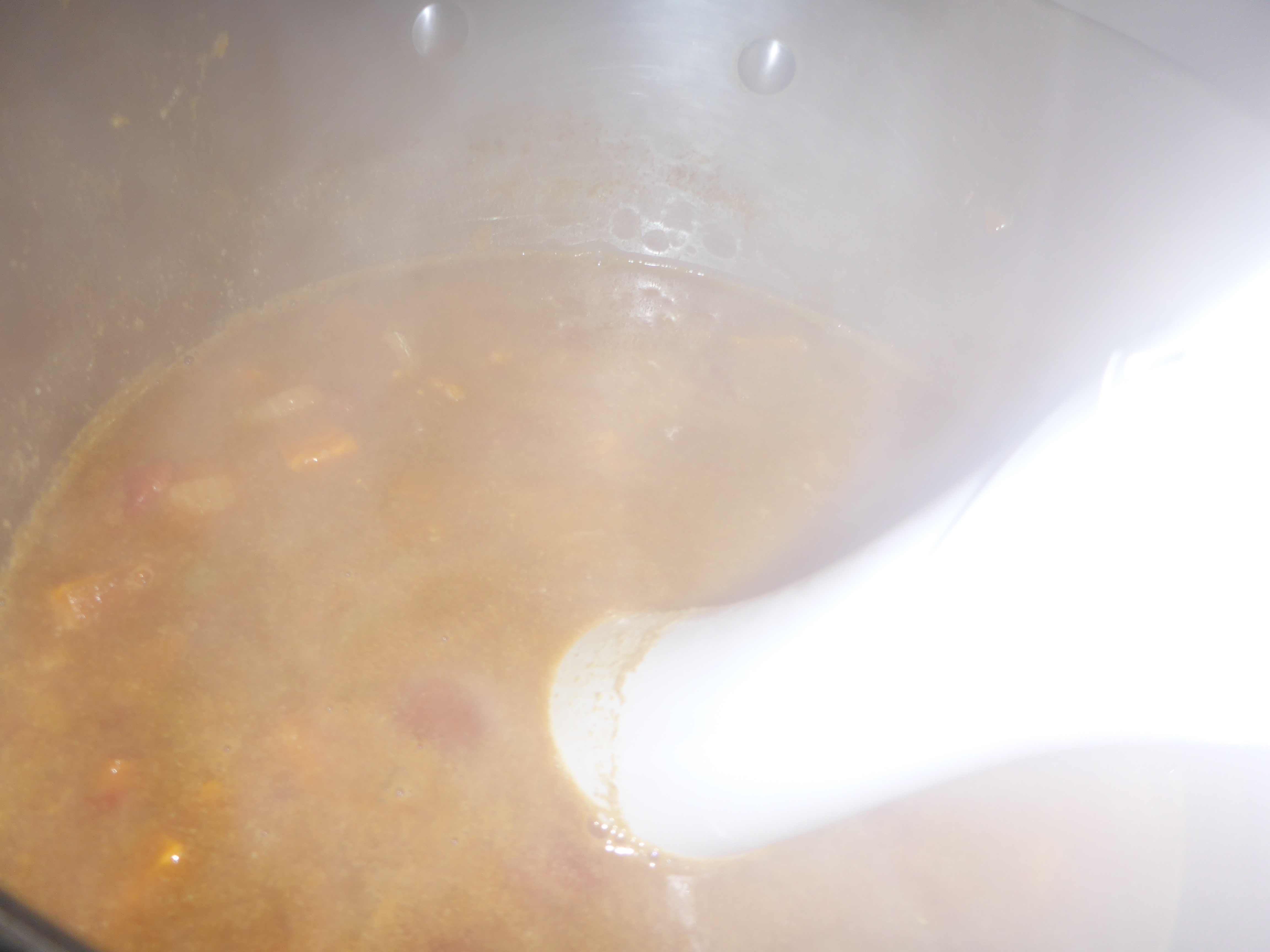 - Add peanut butter and stir well. Using an immersion blender, blend soup till about half of it is pureed and the other half still has texture. The soup should appear creamy, but chunks of sweet potato should be visible.