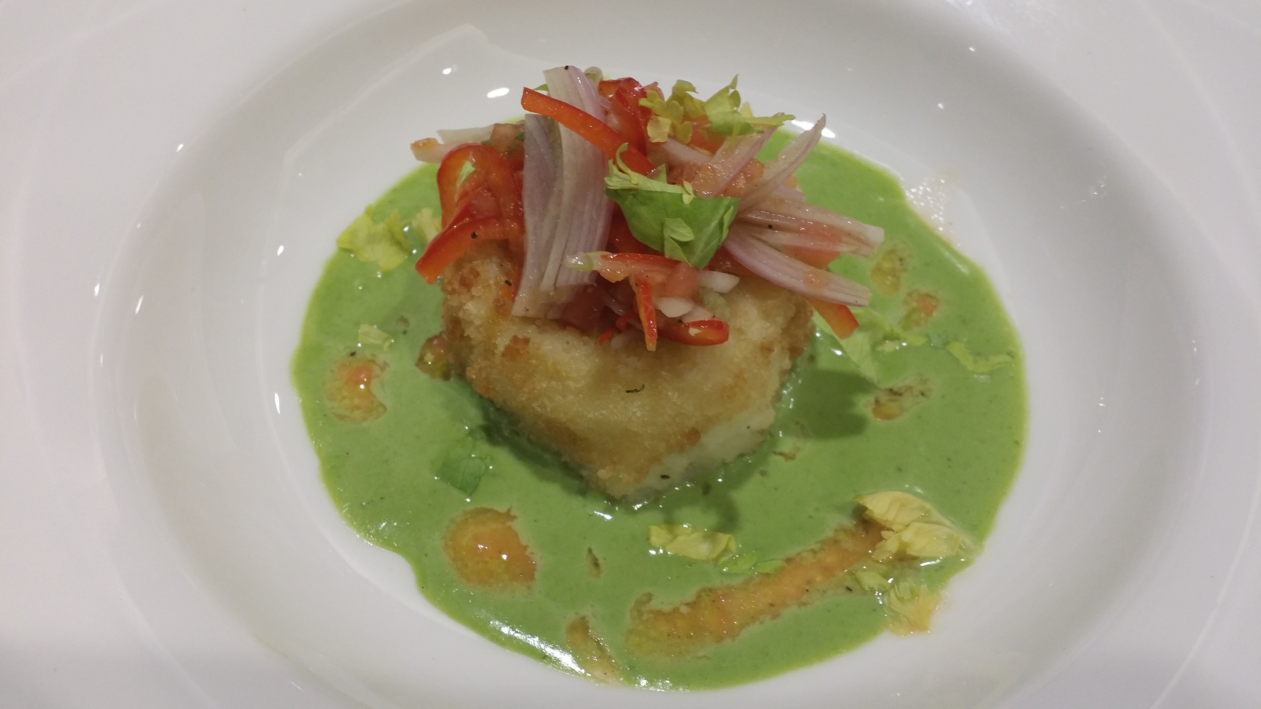 The next course was a grilled potato patty in a pistachio sauce. I could’ve eaten two more of these tasty patties, and the only thing that stopped me from licking the bowl clean was my stone cold sobriety.