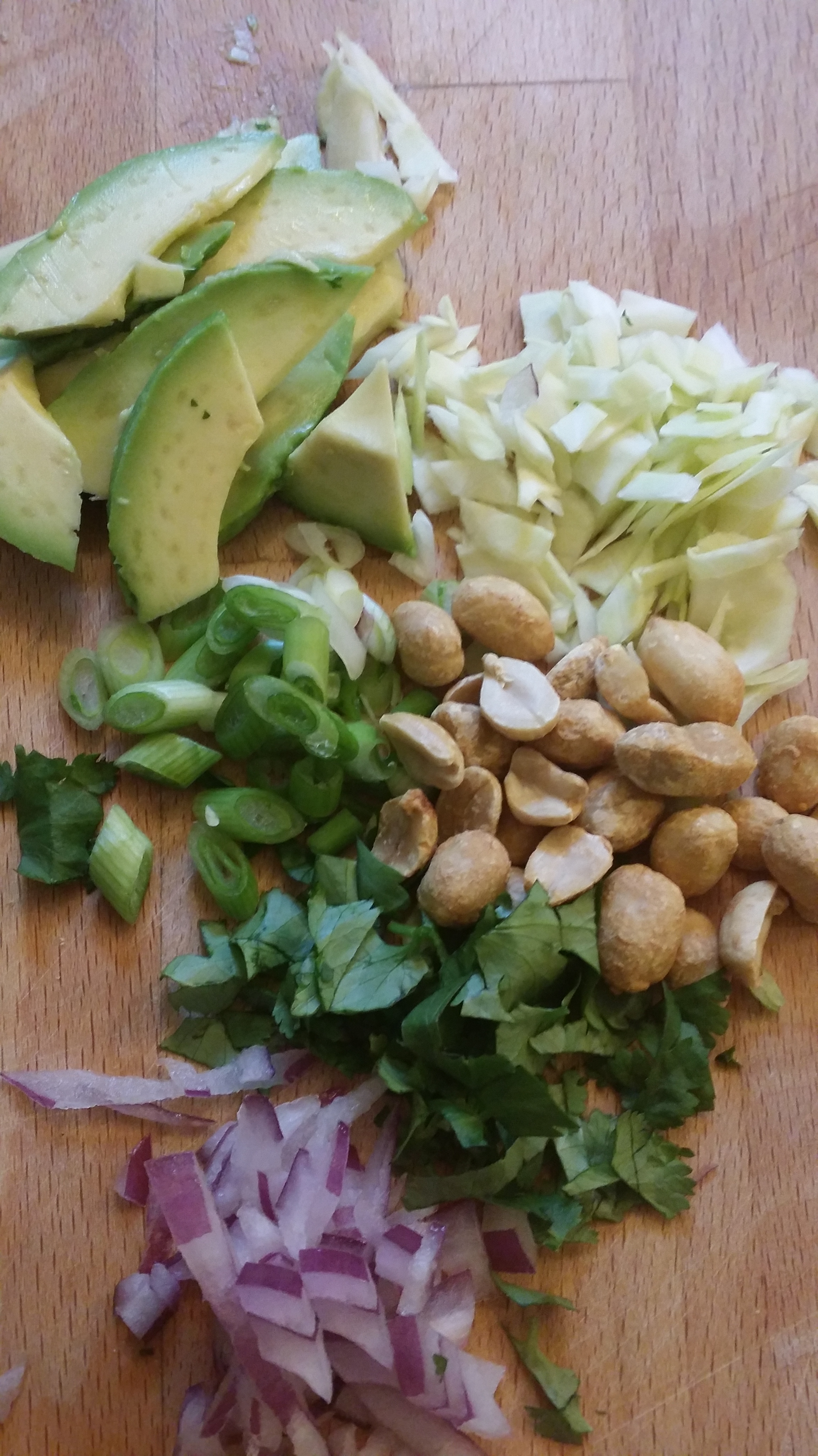 I added peanuts, onions (green and red), and cabbage for crunch; I then added cilantro, avocado, and a big dollop of vegan queso (which is fantastic the next day!!) to add some complexity taste-wise.