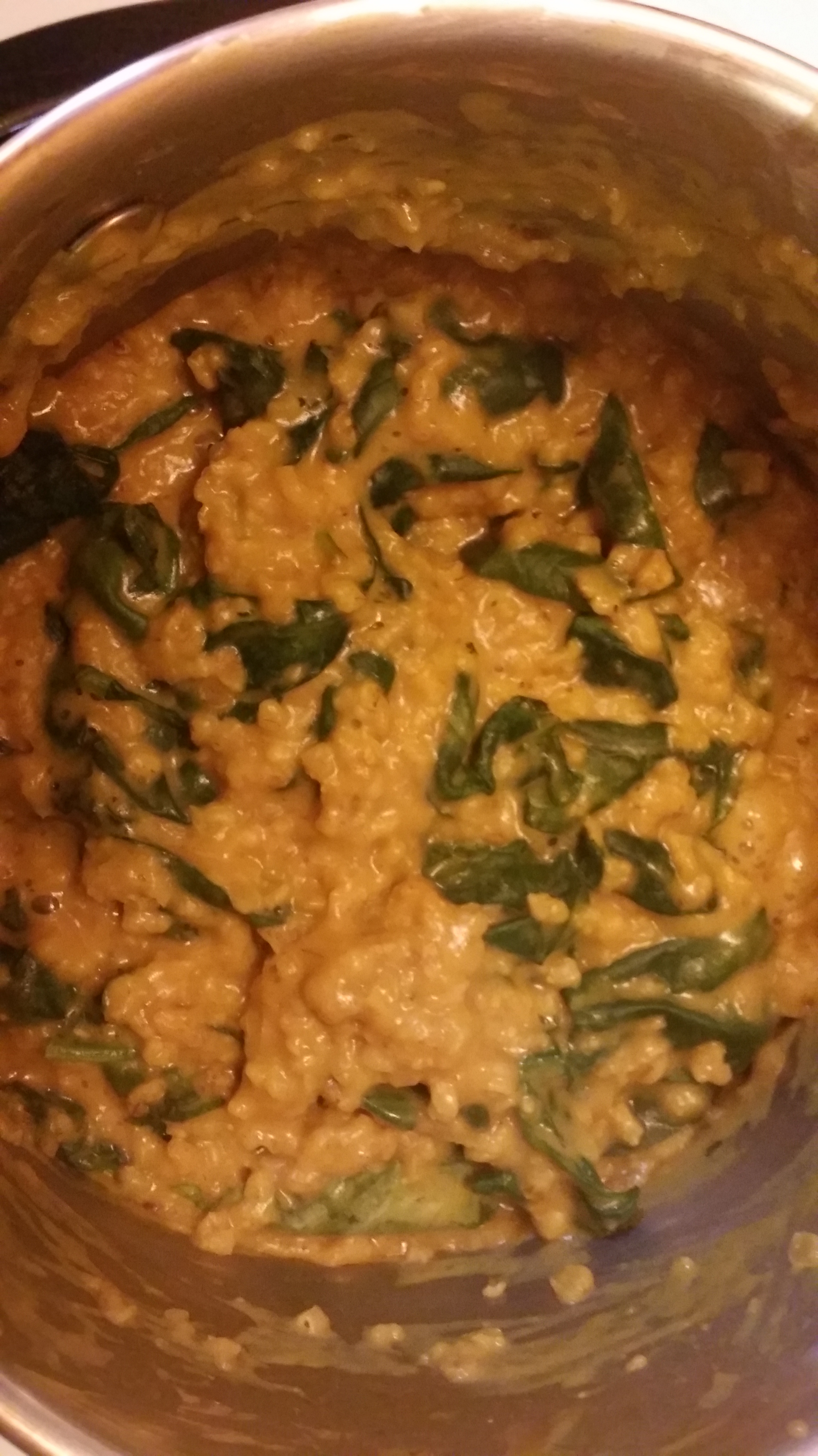 Add two cups of baby kale and spinach and stir just until the greens are wilted: