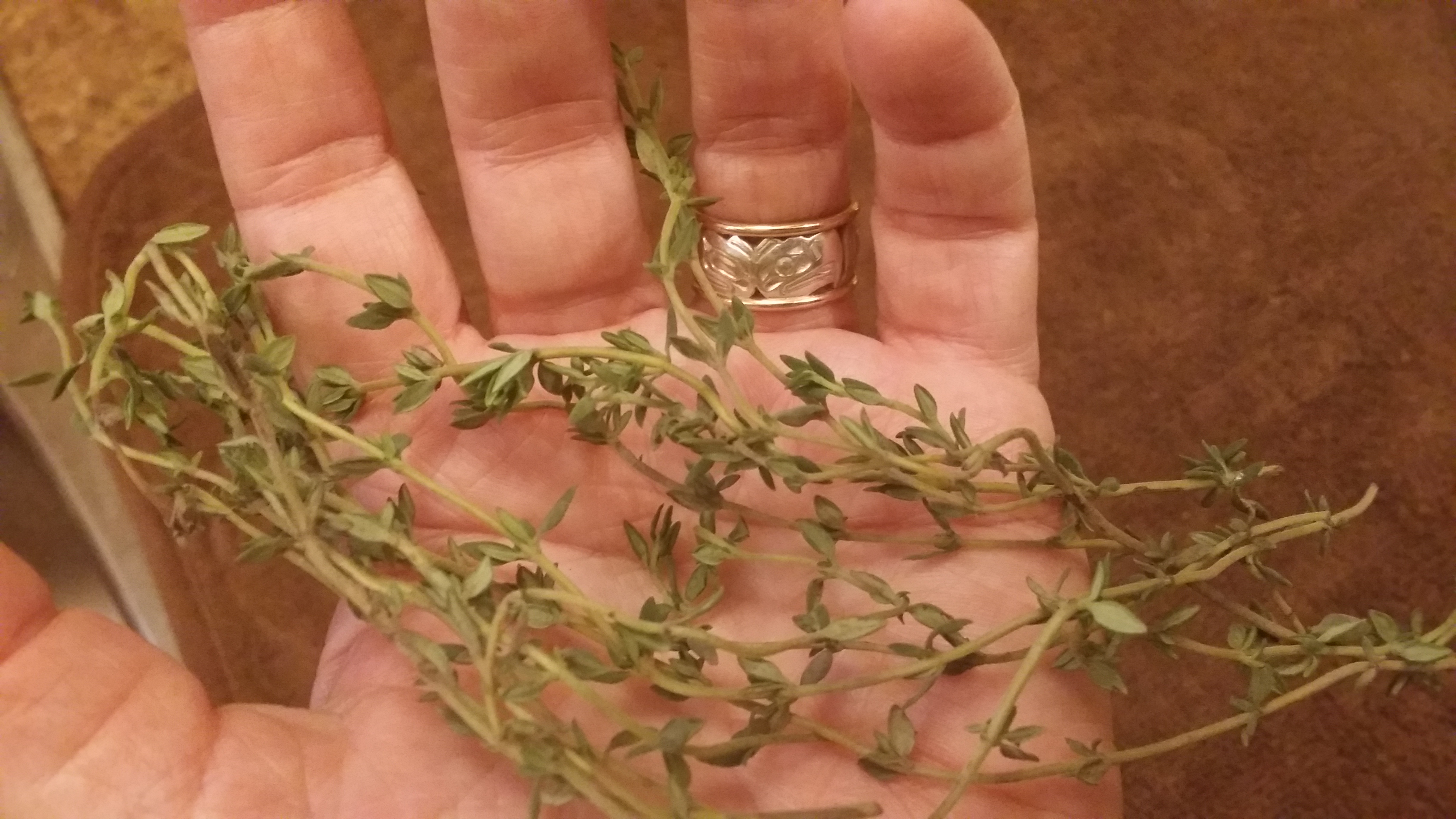 The rosemary, parsley, kale, arugula, and Swiss chard are from the garden, and the rest is what we brought up, but haven’t yet gotten around to eating.