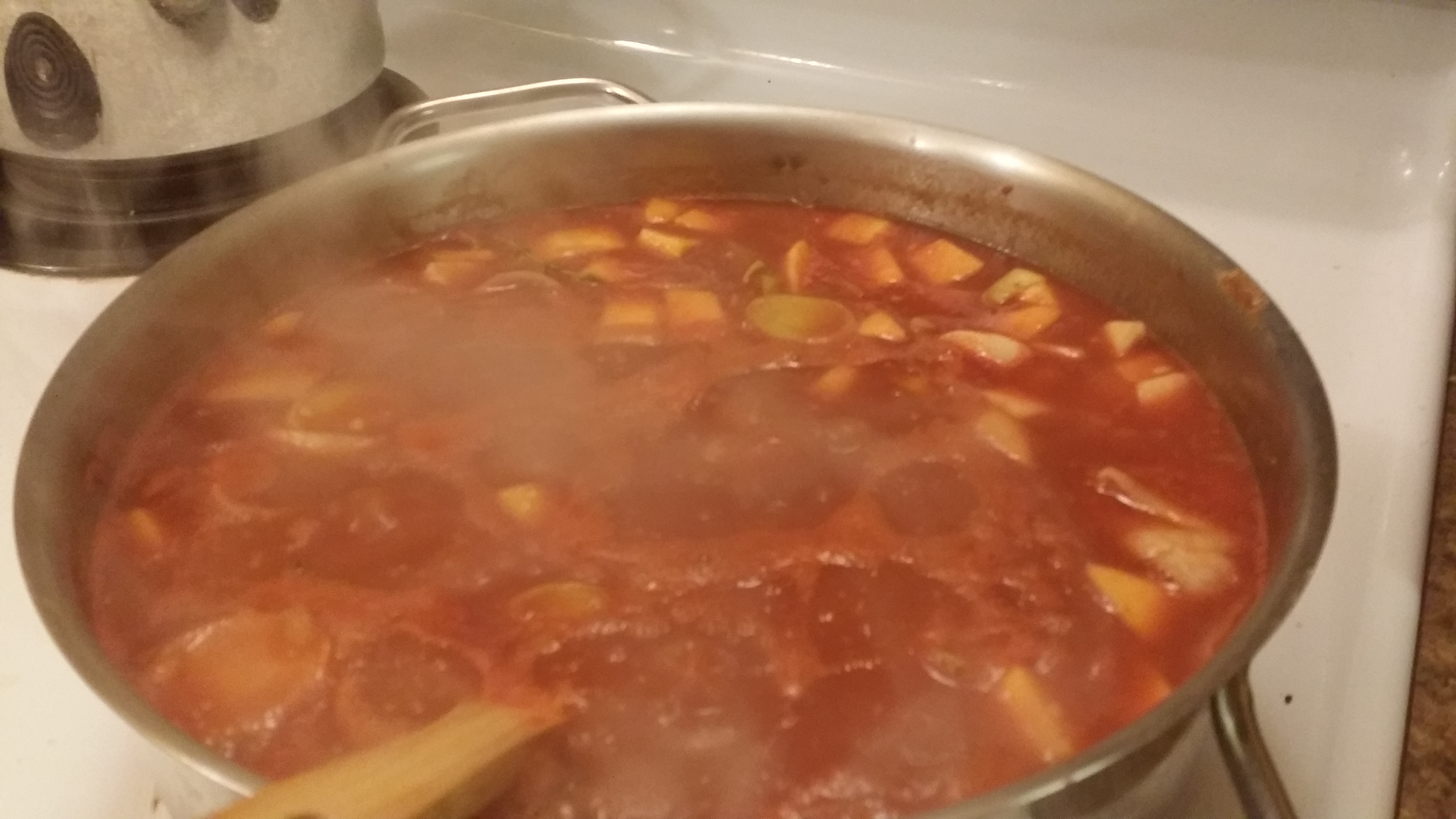 - 1 28-oz. can crushed tomatoes (in future, I’ll add four chopped tomatoes because the crushed tomatoes kind of overpower the stew)