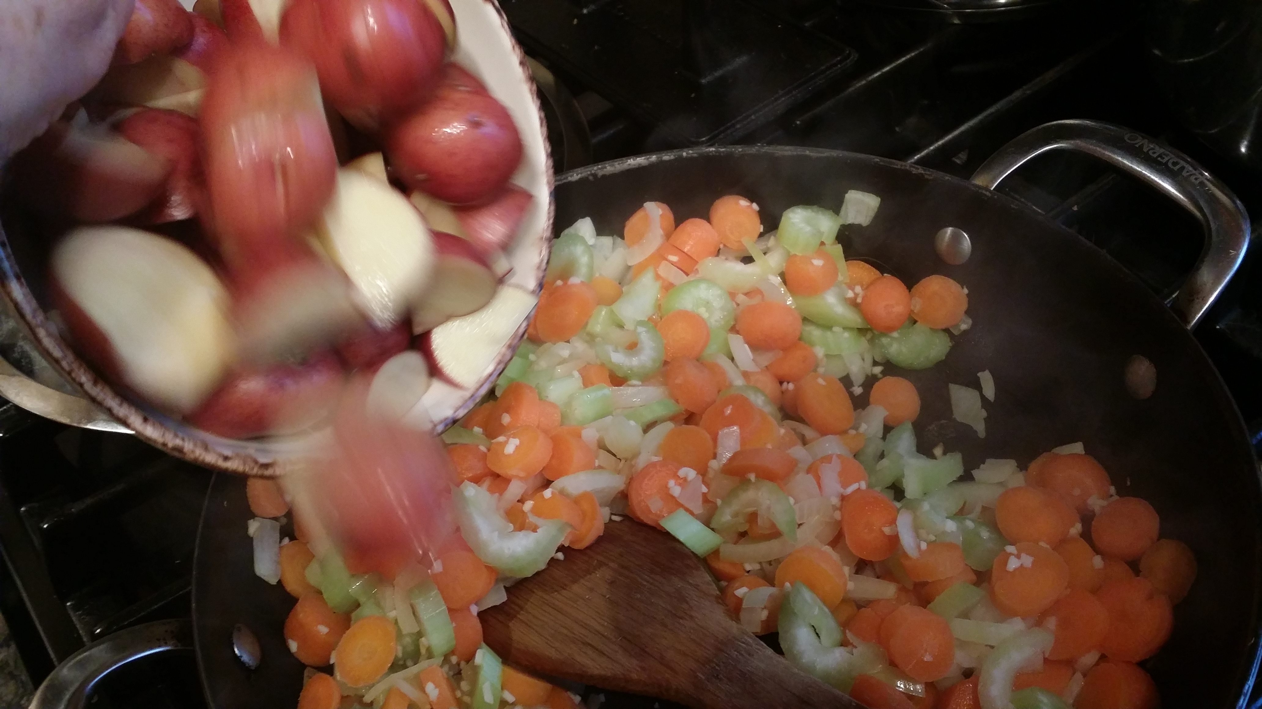 - Spray a skillet and brown onion, garlic, carrots, and celery.
