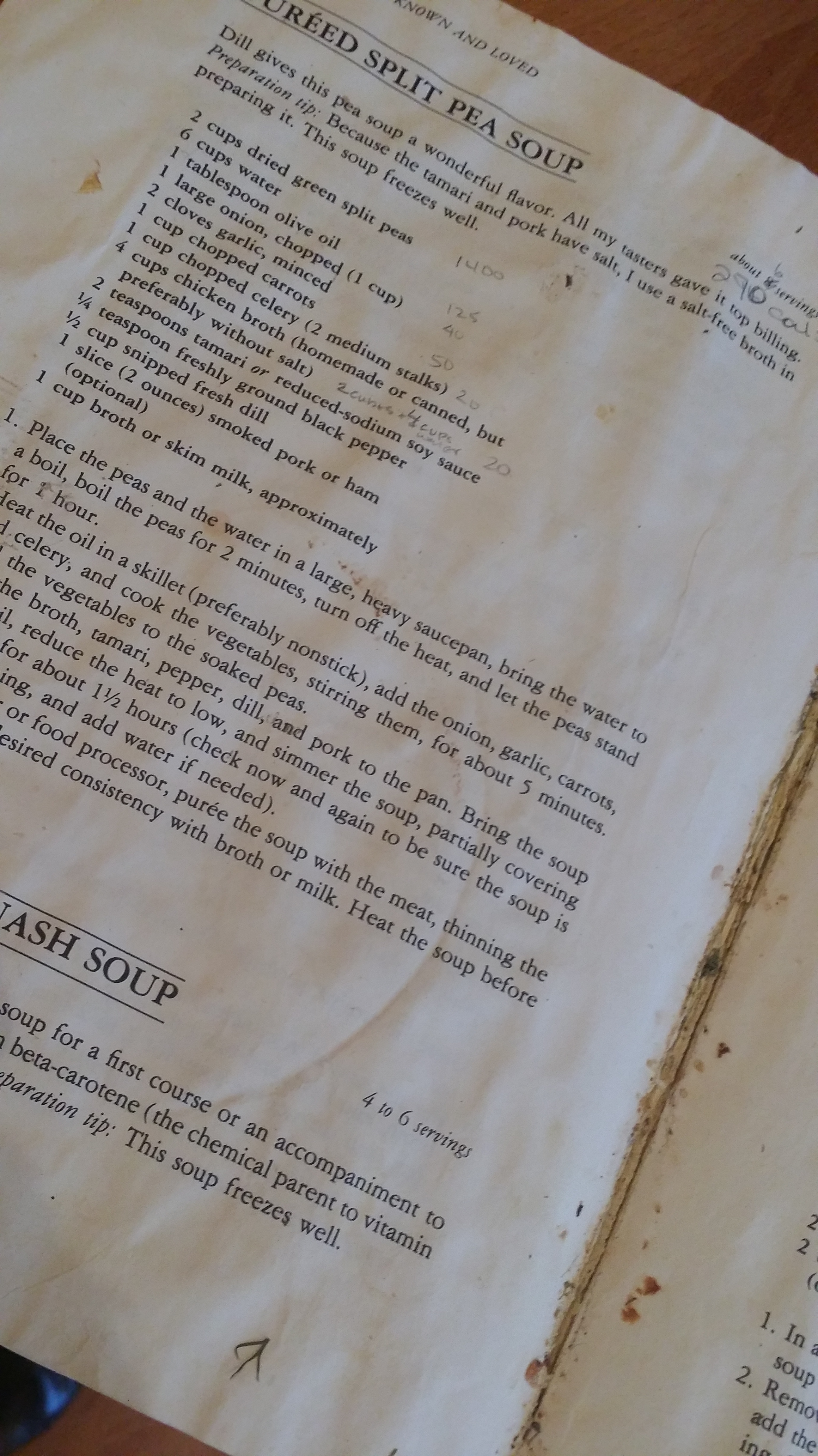I still have the book, and the page for the pea soup is very well used—covered with splatters and moisture wrinkles, my pen jottings in the margins (little numbers related, no doubt, to calories)…
