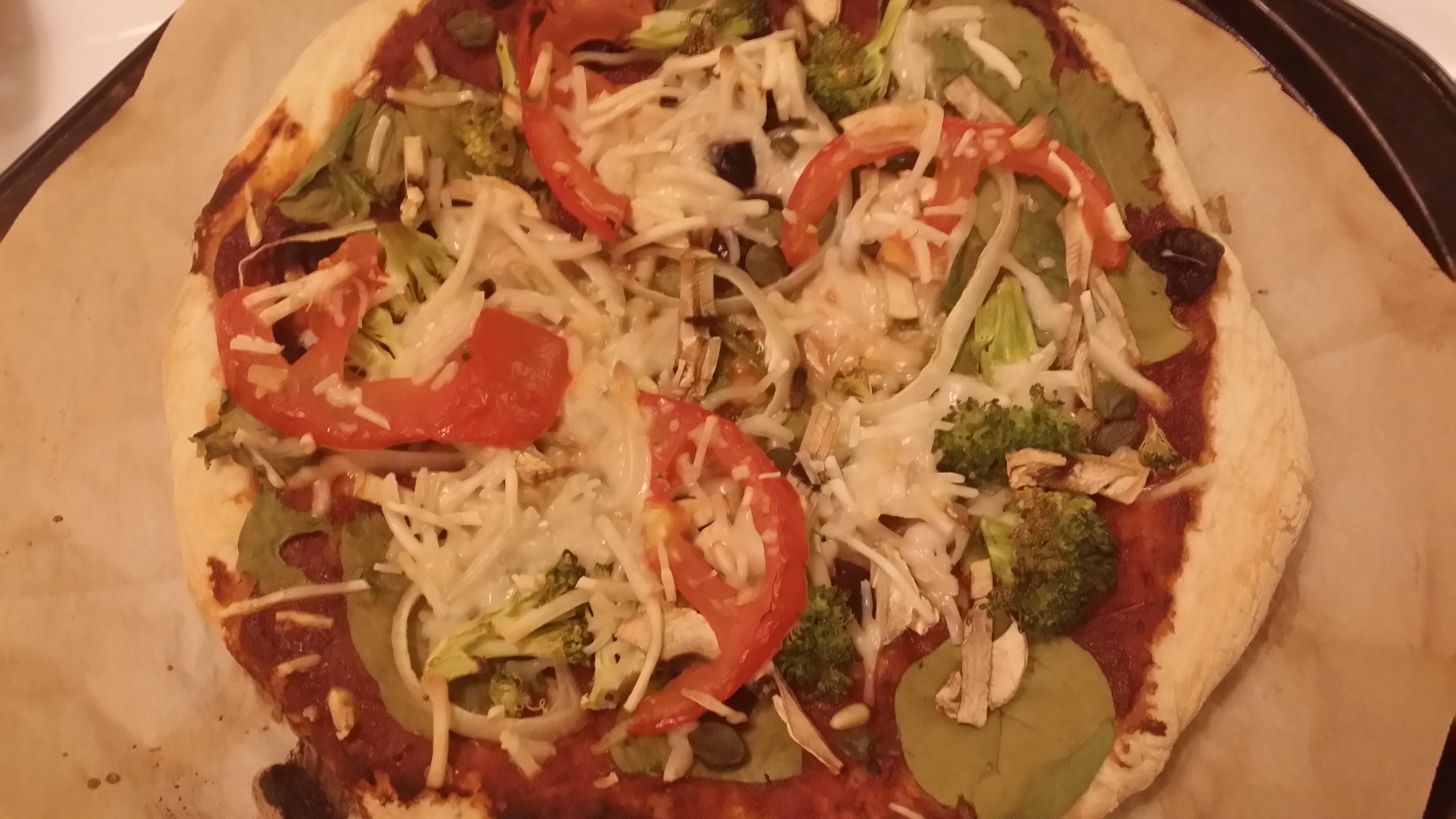 We had a fabulous time with our guests–my niece, Annie, and her best friend, Kitty (yes, Kitty-the-nutritionist who gave Annie the tip about sprouting beans, nuts, and grains). We ate lots of food and drank lots of alcohol (though I managed to refrain from drinking!!) and chatted the weekend away. The weather has been fabulous and James and I managed a couple of great hikes. The teenagers (they’re actually 27 and 36 years old) left yesterday, and we spent Monday hiking…and then working on our online courses. I had some dough rising for buns, but James suggested I switch to pizza, so I did. I had no sauce, however, so I hunted about for a quick sauce and then adapted it….