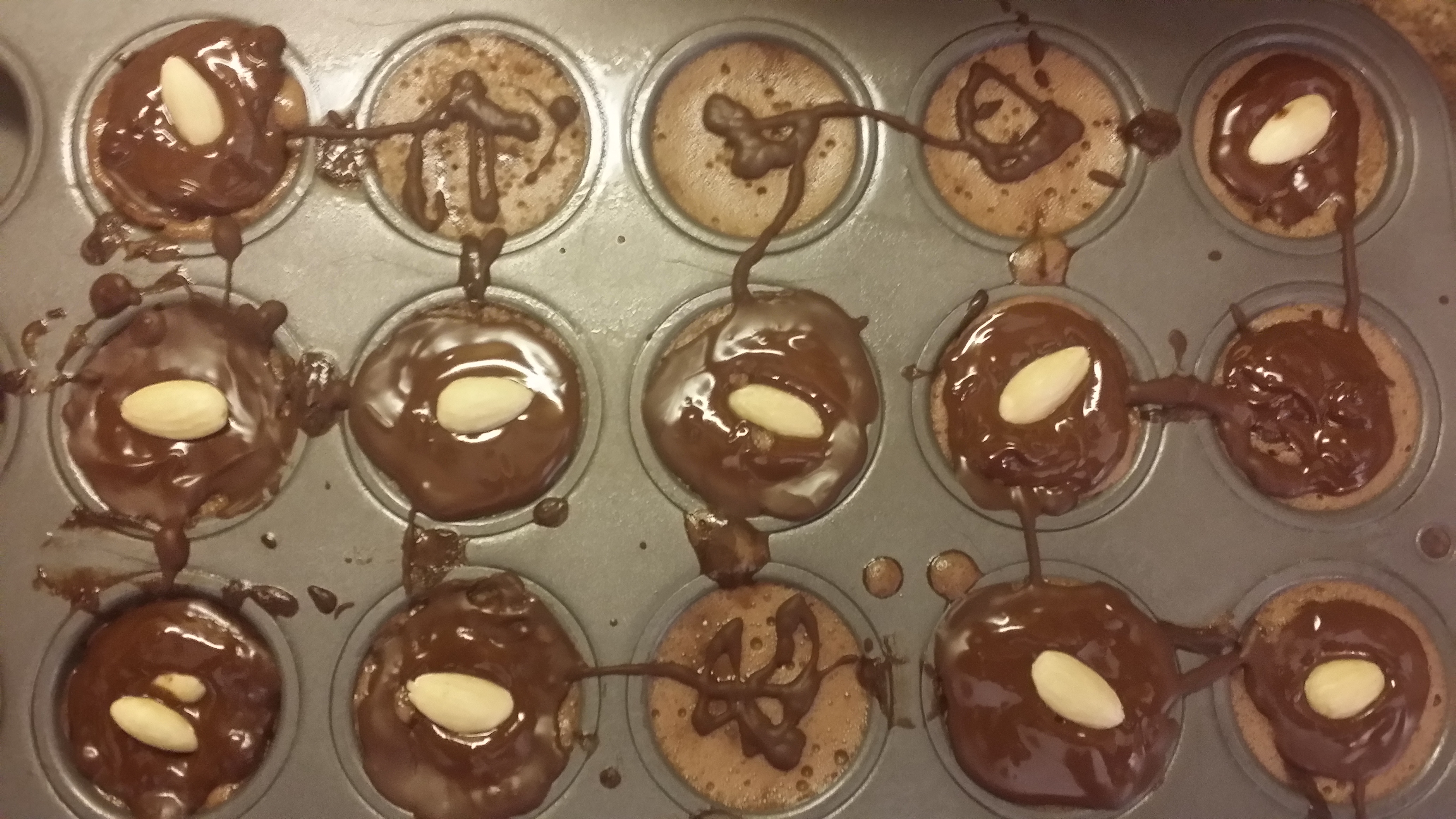 And pour the melted chocolate over the tops of the little cups. You can cover the top, or just make little squiggles…and you can add a nut for a nice crunchy finish!