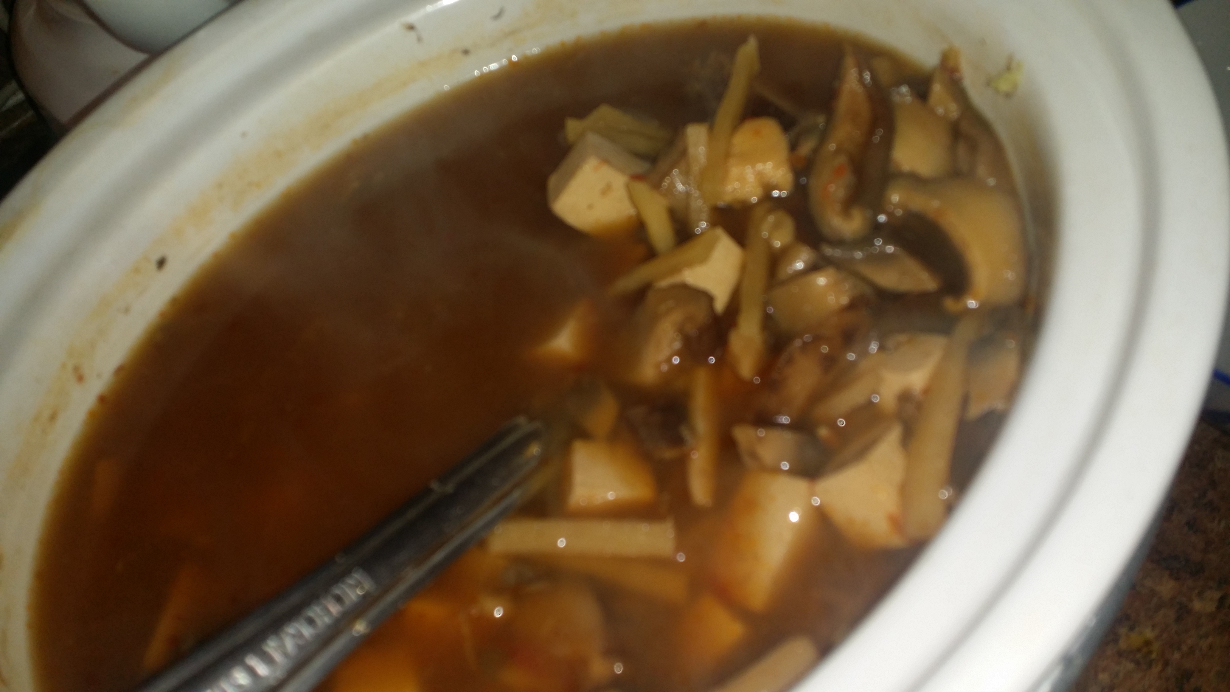 In light of this great bargain, the other part of our dinner was Hot and Sour Soup with shitake and cremini mushrooms (OMG–SOOOOO good even without the bean sprouts!):