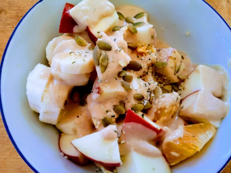 Anyway, after all that gardening, I needed a hearty snack, and a fruit salad seemed just the thing. I’ve recently discovered a rather delicious (and very straight forward) fruit salad dressing.