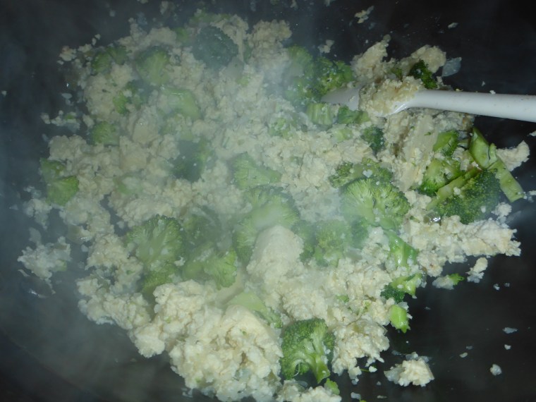 Brown in a wok for a couple of minutes, then add the crumbled tofu and continue browning until the onion is translucent.