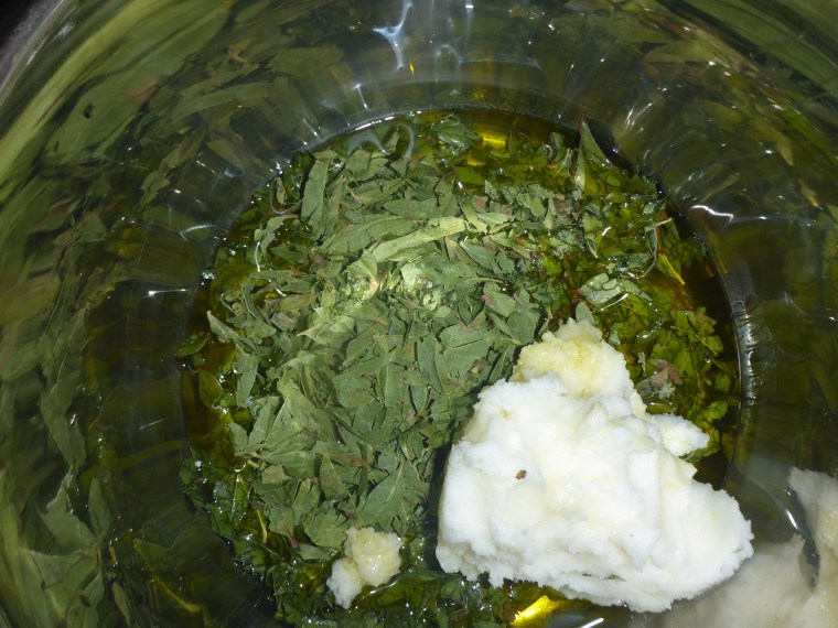 Since I’m running low on my lotion bars, I figured I’d use the leaves–along with some of my fresh rosemary–to create a refreshing-smelling body butter.