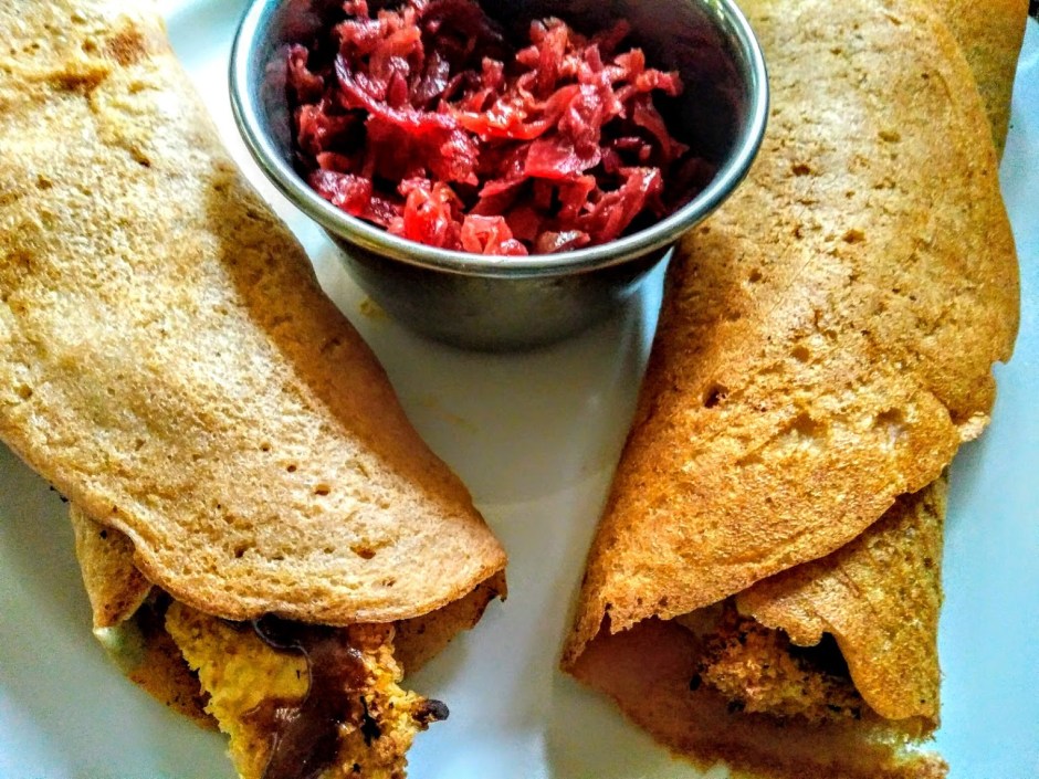 If you don’t have a high-powered blender such as a Vitamix, you need to soak the lentils for several hours and then blend. If you have a Vitamix, just blend like hell and you’ll soon have a lovely pink batter similar in consistency to pancake batter. It smells like grass initially, but this eventually dissipates.