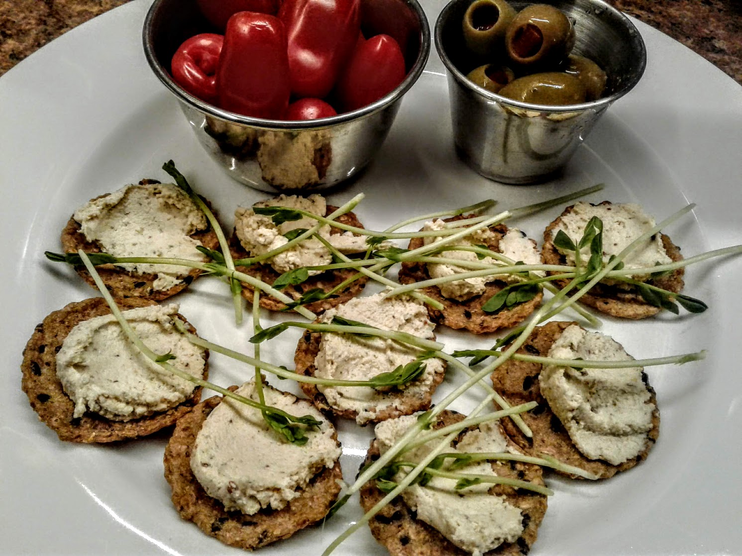 Erin’s recipe is great, and the version Annie sent me included the addition of garlic powder. To this, I added capers (and brine), BTB, and mustard. I also replaced the oil with three TBS of cashews. I am LOVING the result, though it’s still setting. Nevertheless, I couldn’t resist and had a little plateful of Mary’s crackers spread with it. As Annie suggested, it seems more like a flavoured Boursin than anything as hard as feta, but we’ll see if it sets up more overnight.