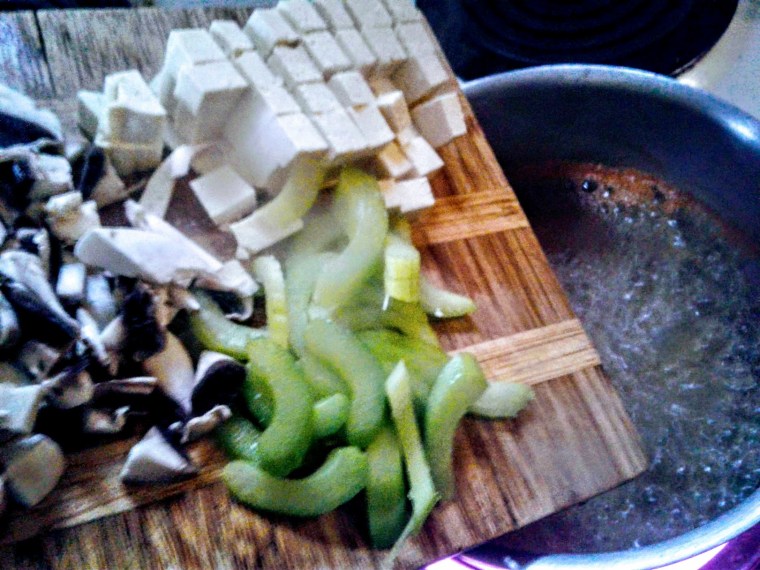 Let it boil for one minute, meanwhile, chop a couple of mushrooms, half a stalk of celery, and a couple of ounces of tofu:
