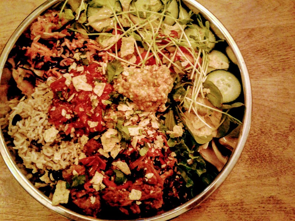 This is really just an assembly, but the combination of salad, slaw, enchilada filling and rice topped with guacamole and salsa is just so delicious and fresh tasting!
