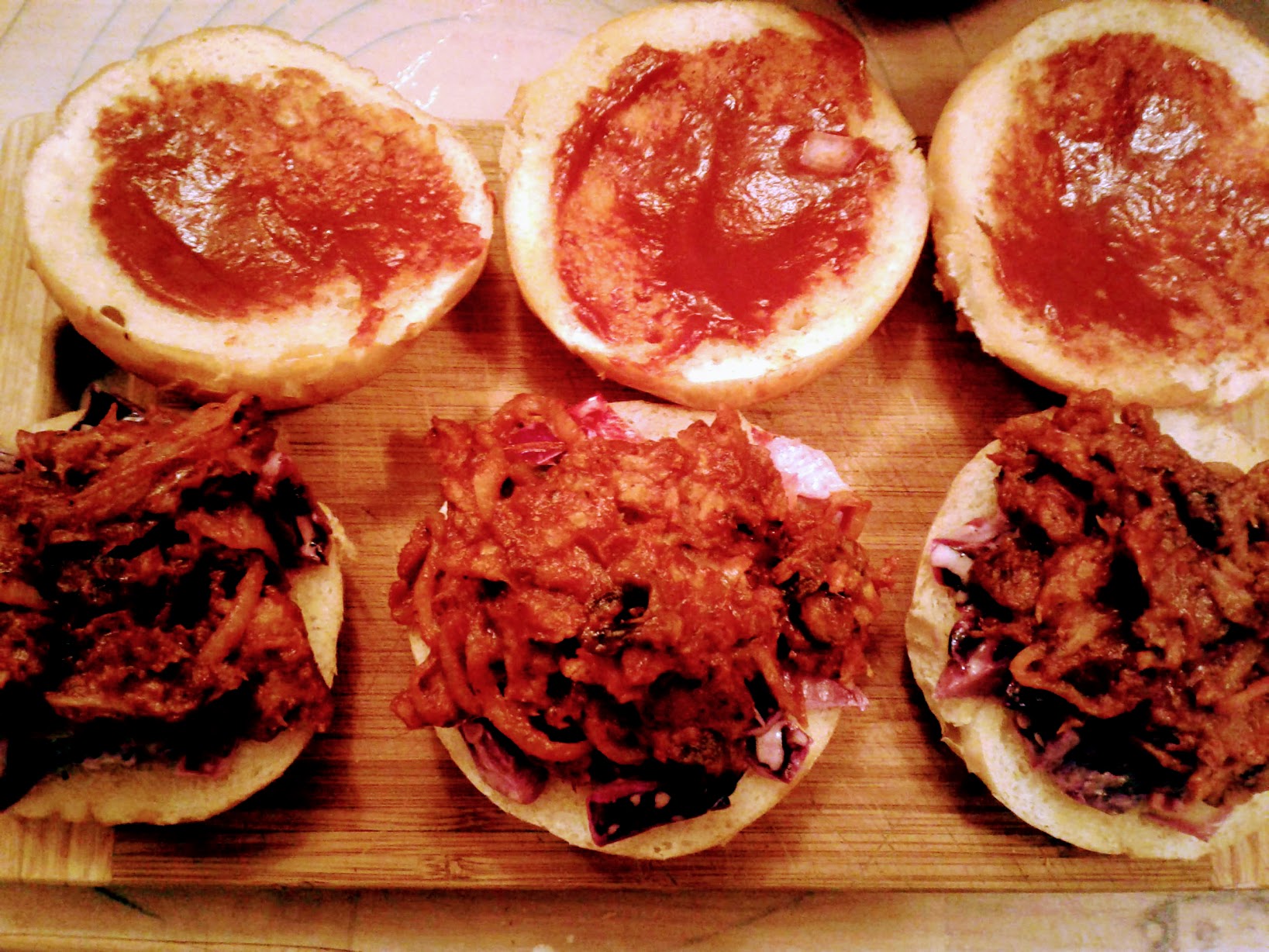 Yesterday evening, James had a hankering for a barbecue chick’n sandwich, so I whipped him up a couple of these sambos and he was so taken with them that he asked for a THIRD. Now, the man is a bit like a snake in that he has a bowl of cereal in the morning and eats nothing else until dinner, so it’s not surprising that he can put away a LOT of food in the evening, particularly since he exercises for…..drumroll please….TWO HOURS A DAY.