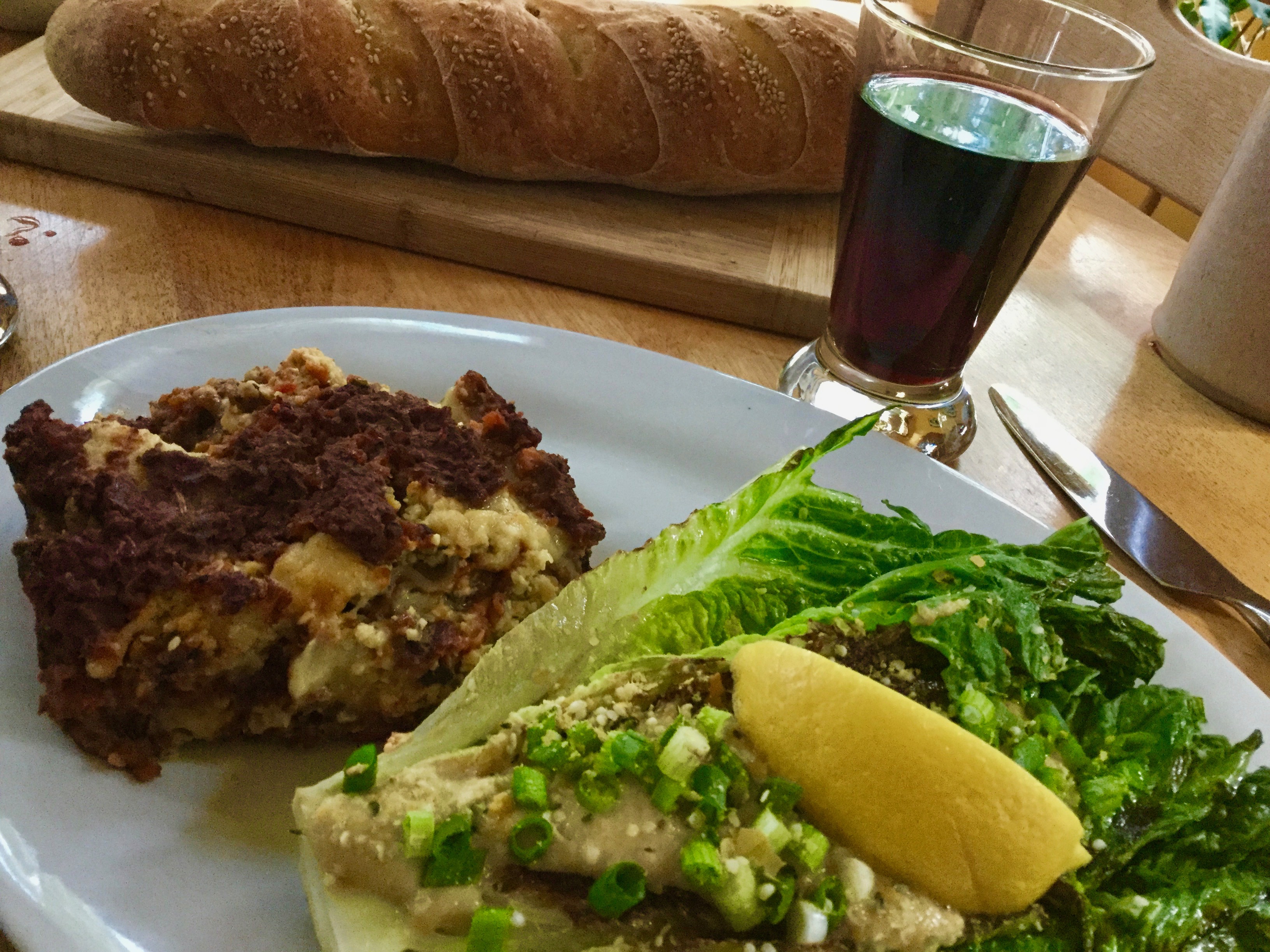 And here’s a pic of our dinner: grilled Caesar salad, Kate’s vegan lasagne, and a freshly baked baguette!