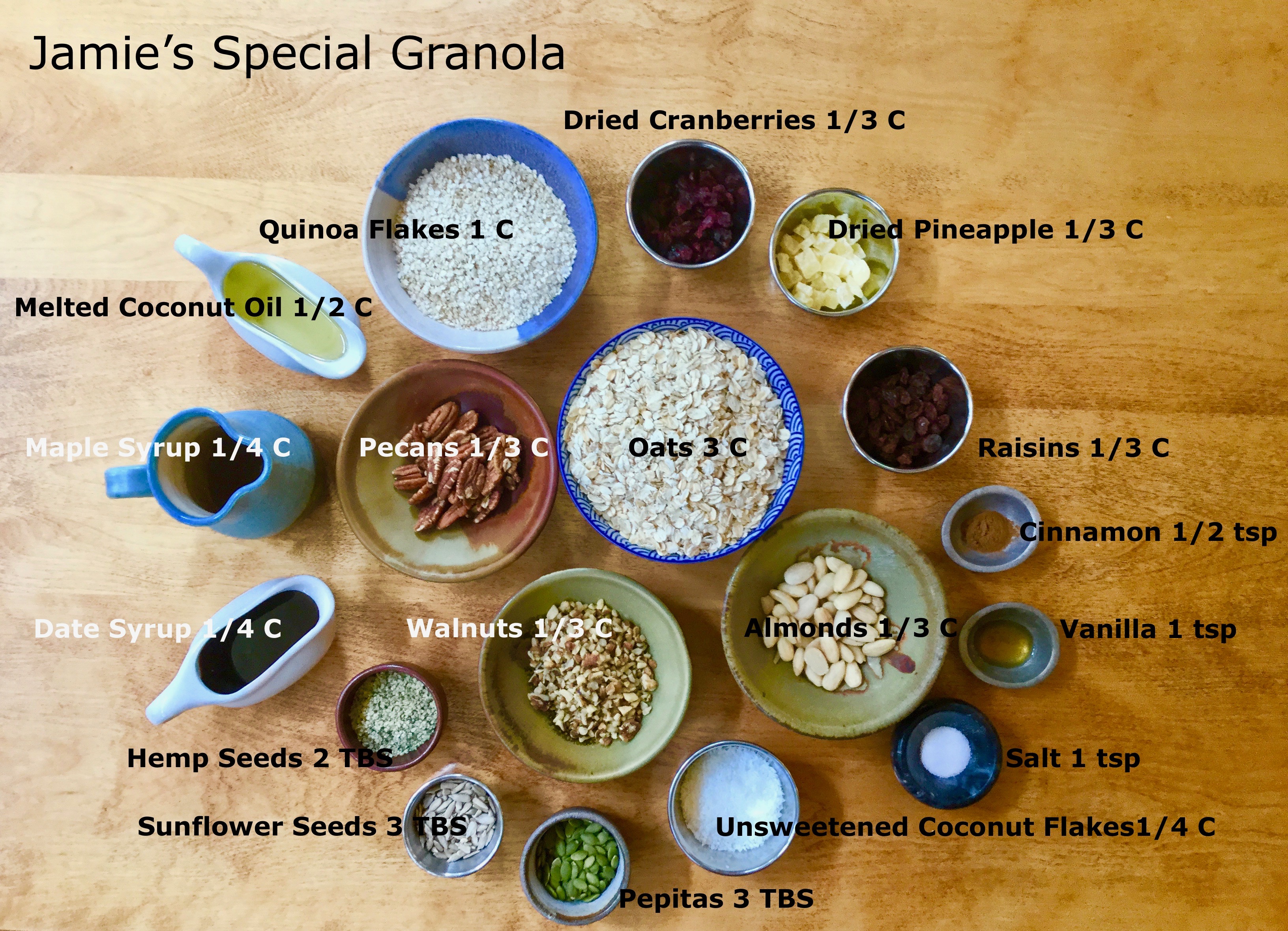 As for the grains, nuts, seeds, and fruit, I figured I’d try to include as many different forms as my pantry would allow. Thus, I included oats, quinoa flakes, pecans, walnuts, almonds, hemp seeds, pepitas, sunflower seeds, unsweetened coconut flakes, dried cranberries, dried pineapple, and raisins.