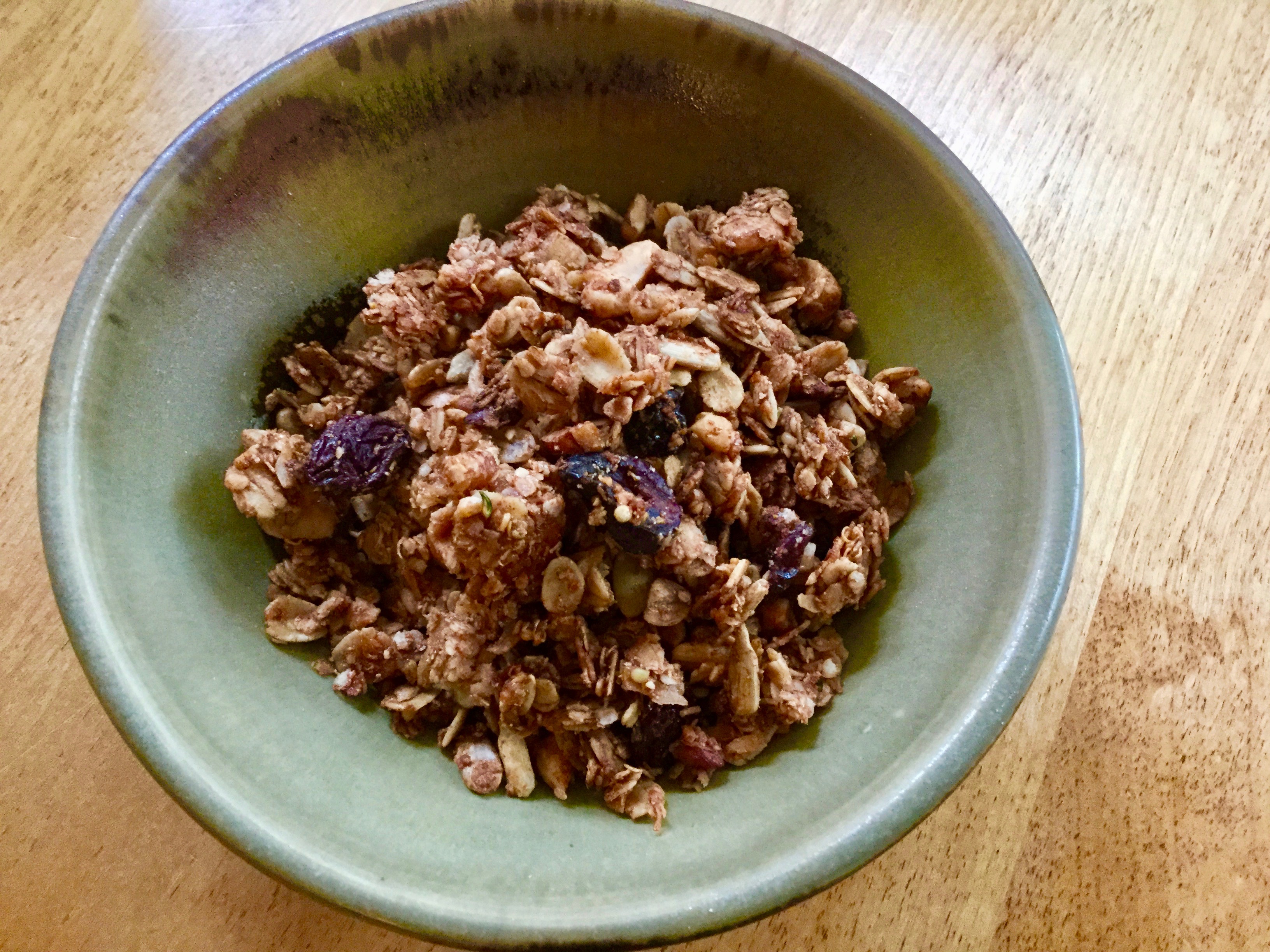 I make a similar recipe to yours but use 1/4 cup of honey and 1/4 cup of molasses. I usually use roasted pumpkin seeds, roasted walnuts, and hemp seeds. I only use 1/3 cup coconut oil and 2 tsp ginger, 2 tsp cinnamon. For some reason, my cranberries get too hard after baking so I sub all raisins. Mine gets baked at 275 0n on parchment, stirring every 15 minutes for 45 total. It is a little moist right after removing from oven but is chunky and wonderful when it cools. I modified the recipe slightly from the Run Fast Eat Slow cookbook.