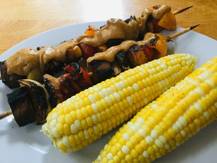The kebabs are an adaptation of a vegan satay James has been making for his various vegan rijsttafel evenings. We all loved them, but had lots of marinated chickwheat left over and decided to have them for dinner again last night. Bid had been for dinner on Friday evening and brought us some luscious corn from Hornby Island, so we had a delightful feast! Here’s the recipe…or process, I guess!