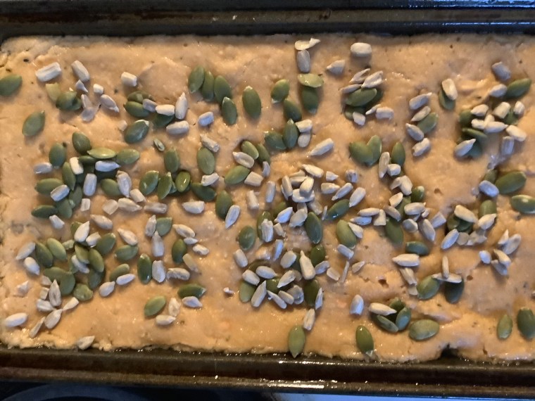 Sprinkle on your loaf with pumpkin and sunflower seeds and bake for 30 minutes (until the loaf achieves an internal temperature of 207 degrees).