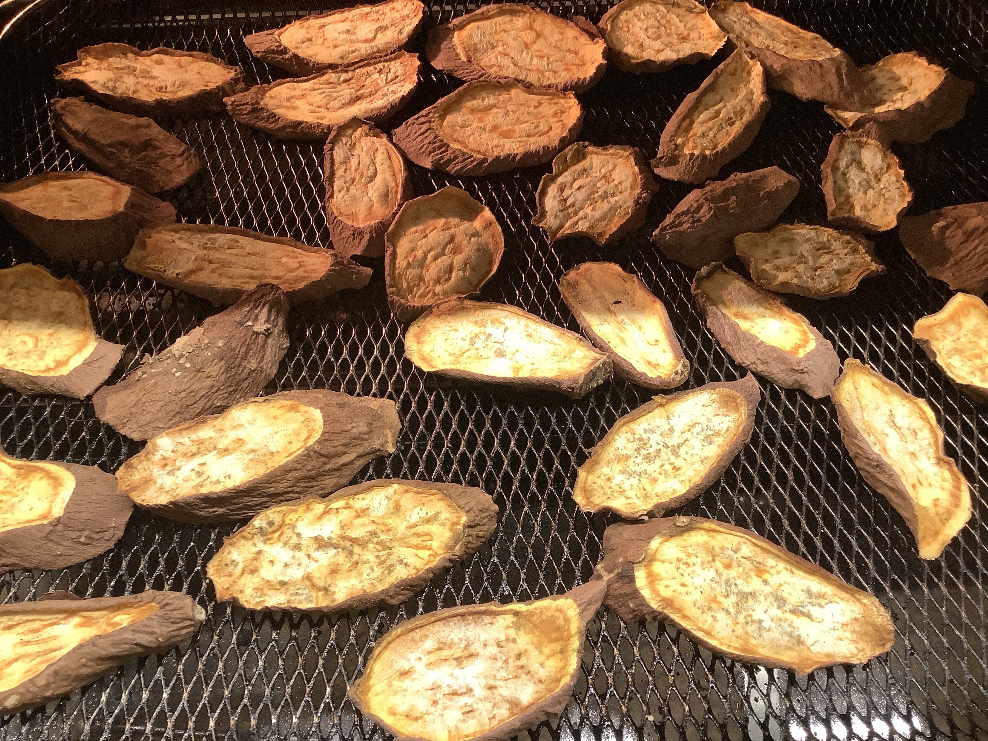 First, I found dehydrated sweet potatoes, so I tried that–I sliced a bunch of small sweet potatoes and baked them for an hour or two at 250 in the convection oven.