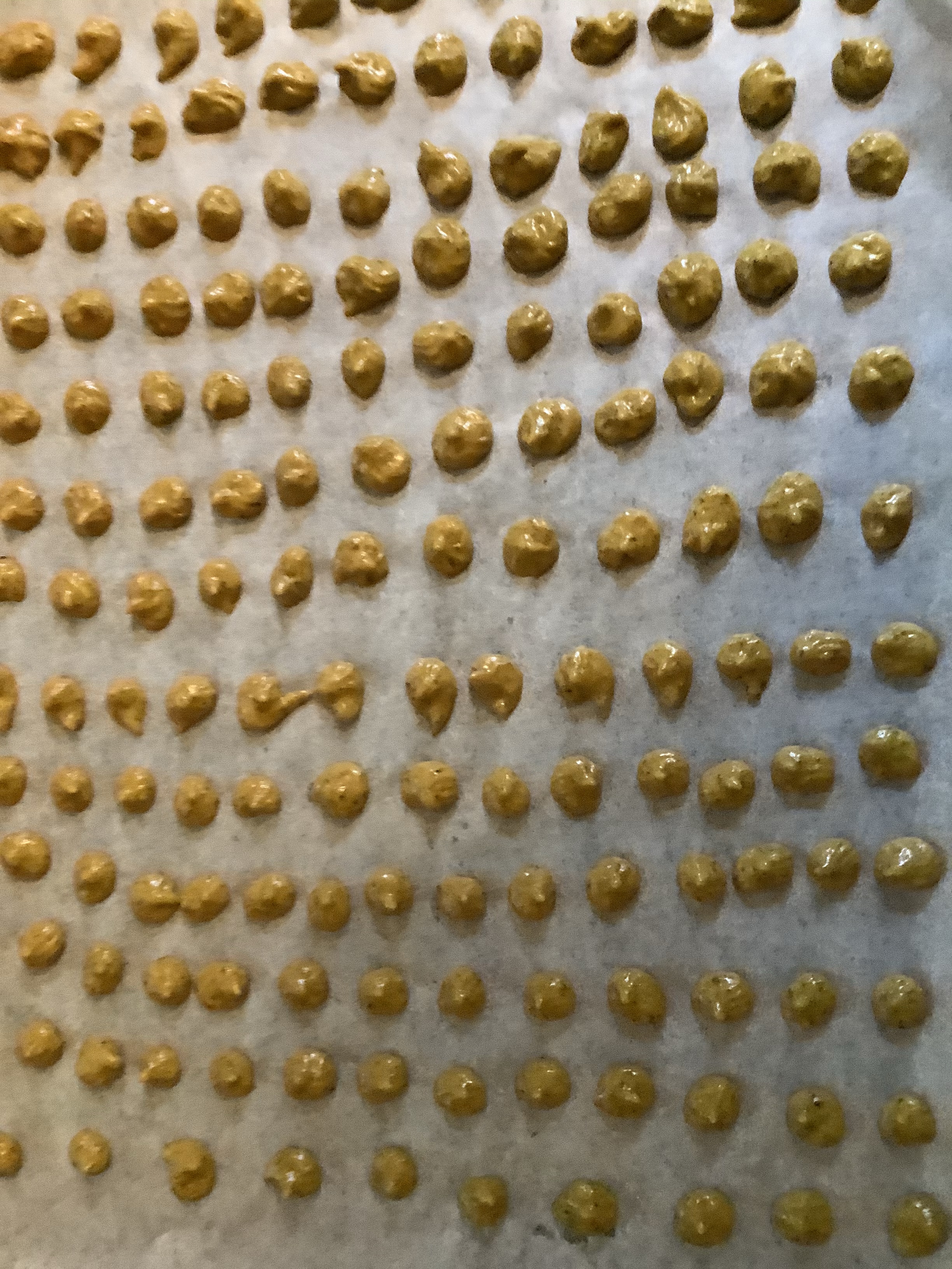 I also tried the fruit leather method for the last little bit of the mixture because the piping is a bit onerous, and it was fine as well. For the fruit-leather method, you just spread the batter over a sheet of parchment, cover with another sheet and push to the edges of the parchment to get a very thin coating and bake for a couple of hours at 170. Use a pizza cutter to cut into small pieces.