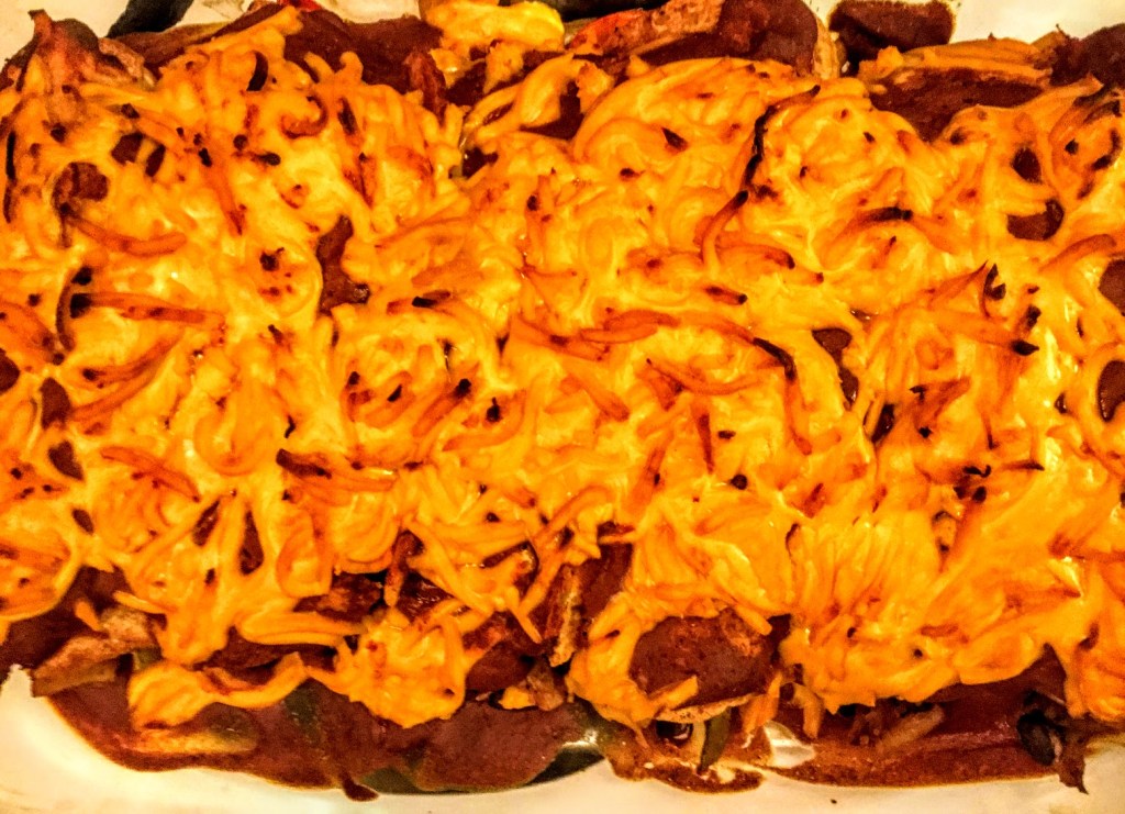 The chick’n enchiladas were delicious, which is surprising considering that we have been unable to go to town for groceries since January 2nd and had no fresh produce except an onion and a sweet potato (which I air-fried first). I managed to scrounge up a bit of kale and chard from the veg trugs outside as well, and we had a half jar of red peppers in the fridge–oh, and a can of black beans. For my regular enchiladas, I usually use fresh tomatoes, red peppers, mushrooms, and serrano peppers, but today’s recipe was just as scrumptious as usual!
