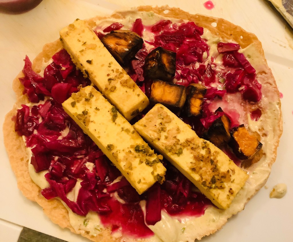 And though I was making vegan enchiladas with the tortillas, we both wanted to ensure that they tasted okay before I baked up a giant casserole dish of enchiladas, so I made a small wrap for James and I to split as a pre-dinner snack. I smeared the tortilla with a vegan blue cheez dressing, then loaded it with James’ sweet-and-sour coleslaw, tofu halloumi, and a handful of air-fried sweet potato. The tortilla passed the taste test (and the wrap was actually amazingly delicious (especially considering I threw it together from a bunch of leftovers in the fridge!).