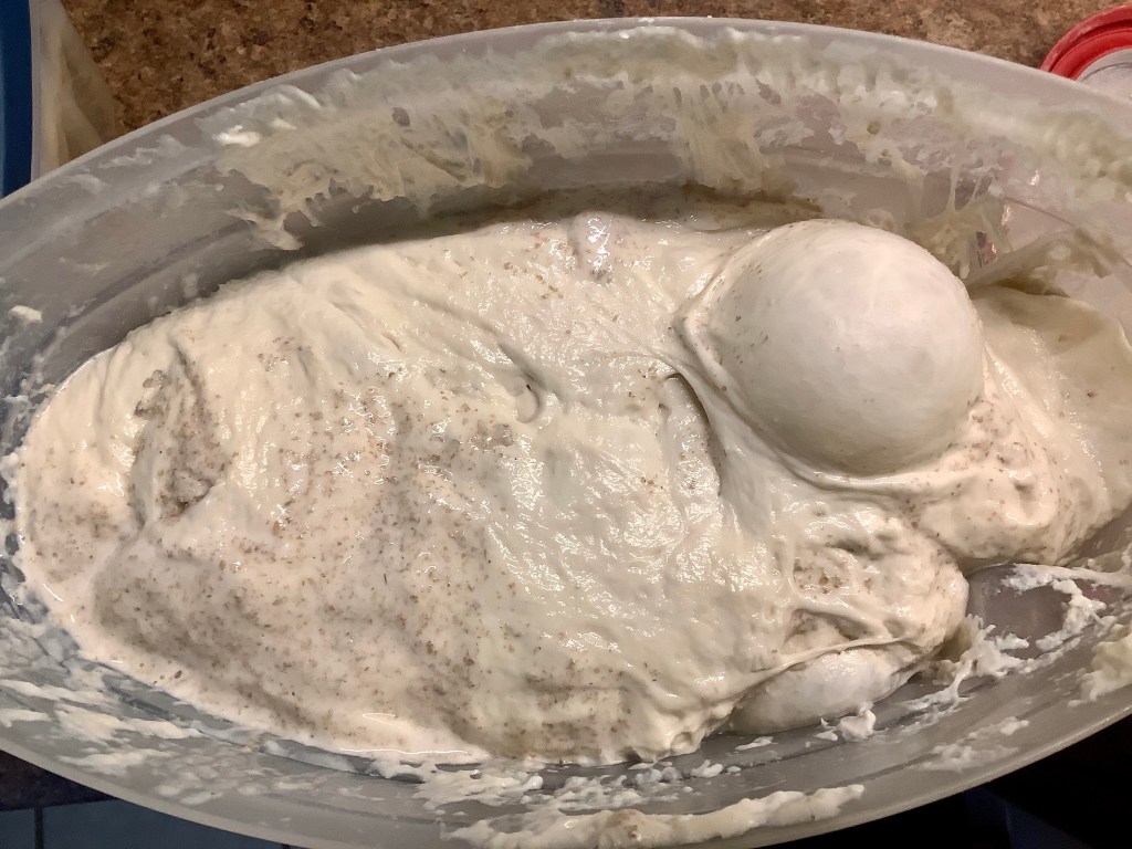 Yesterday, I had only half a cup of discard, not enough to do anything with really, so I dumped it into the jug of no-knead bread dough I always keep in the fridge. I was surprised at my dough’s bubbly response this morning!