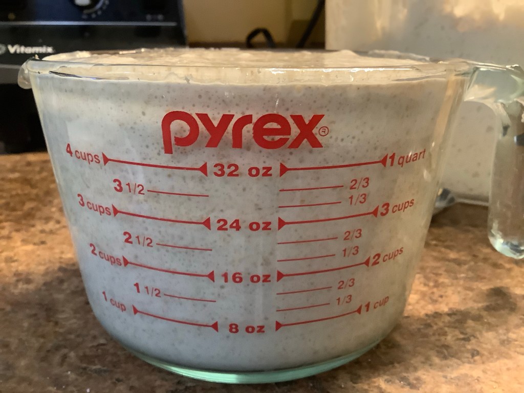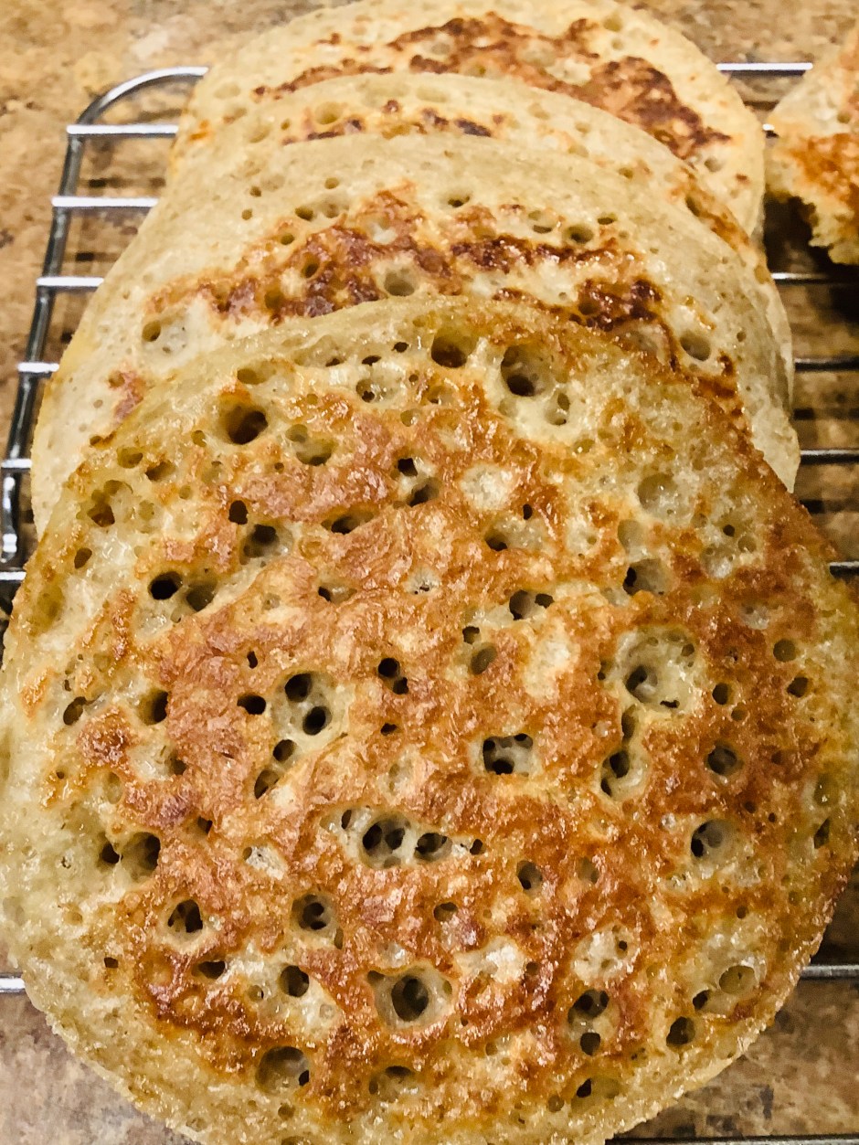Today, I had a good two cups of starter discard, so I thought I’d try a recipe for crumpets Biddy sent me from the Washington Post food section. I doubled the recipe and was shocked that the two cups quickly turned into about FIVE cups of batter with the introduction of the baking soda!