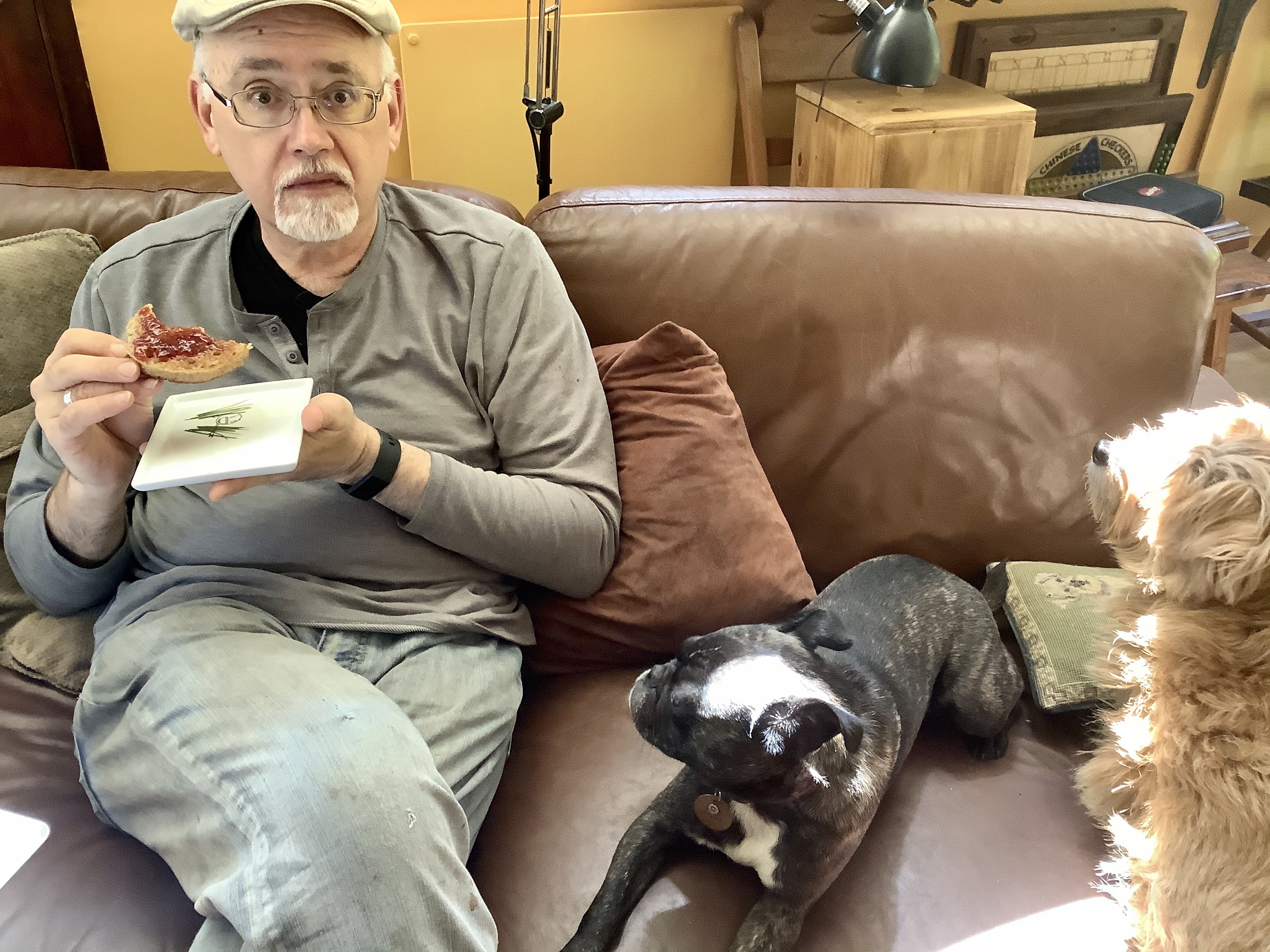 The first six I made were more like pancakes because I didn’t follow the keys above. The last five, however, were just perfect: golden and full of holes!! Unfortunately, we have no vegan butter because we haven’t been into town for supplies for a full month! I scraped the last of our strawberry jam on the most perfect of my crumpets and served it to James, who pronounced it “pretty good….pretty, pretty, pretty good.”