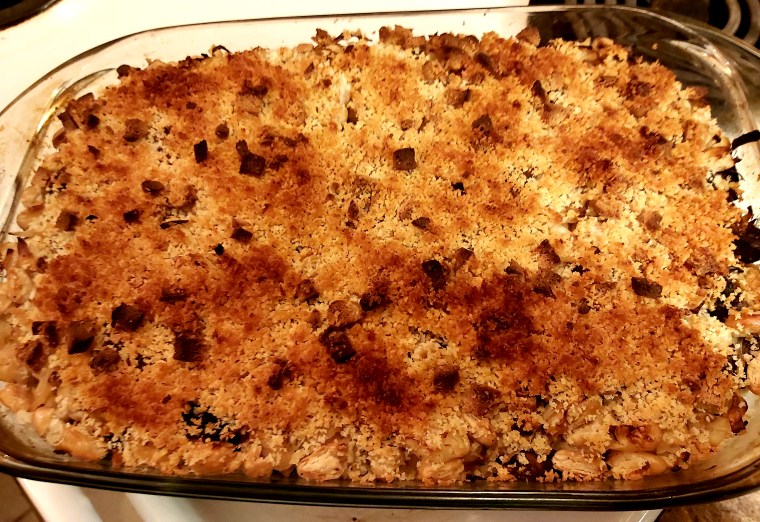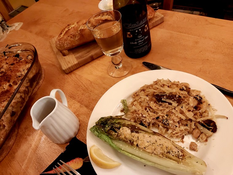 Serve with a freshly baked baguette, a grilled Caesar salad, and a cold bottle of Denman Island Sandy Island White! I expected the casserole to be saucier–more like a cassoulet, but it is not saucy at all. It IS scrumptious though!!