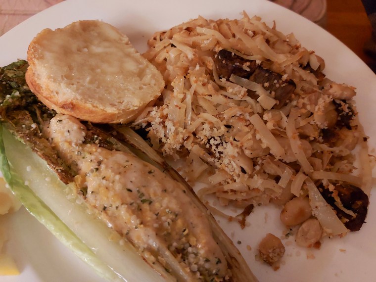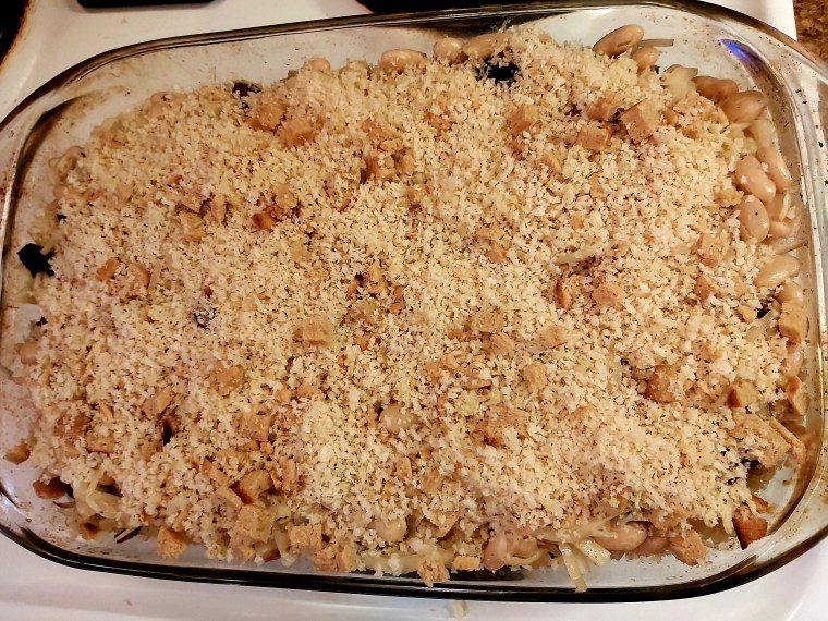 Preheat oven to 425. In a large skillet, saute crumbled vegan sausage in 2 TBS olive oil until browned. Remove sausage to a plate and add cabbage and onion to pan; saute for fifteen minutes, seasoning with salt and pepper. Add coconut cream, beans, and browned vegan sausage to pan, and stir to combine. Add more salt/pepper if necessary. Transfer mixture to an oven-proof casserole dish. In a small bowl, combine remaining 2 TBS olive oil, panko crumbs, and almond feta, and sprinkle evenly over cassoulet: