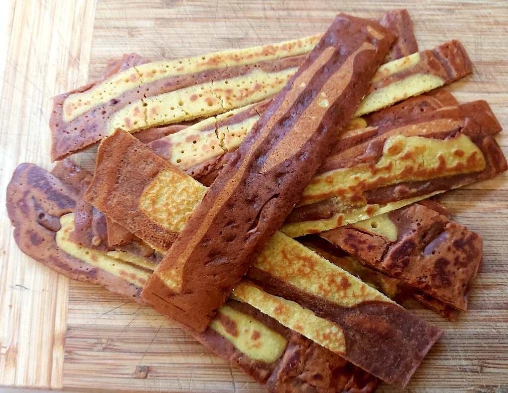 When the other side is cooked, remove from heat and create another square crepe with both batters. Continue until the batter is finished. Next stack the squares up and slice them into rectangles: