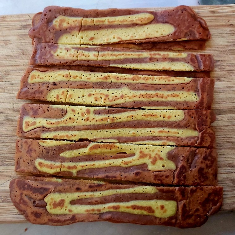 I used the method outlined in this video from The Pot Thickens and this one from Yessica Infante: both cooks divide the batter in half to create different colours. I used the flavourings from my own chewy vegan bacon bits–they’re pretty standard for creating a bacon-y taste.