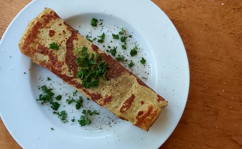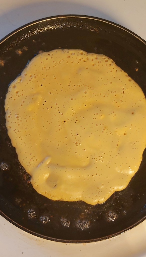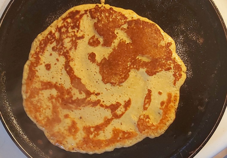 Heat some vegan butter in a pan on medium heat and pour 1/3 cup of the mixture into the pan. Smooth out the mixture with a spoon. Once the top is bubbled and dry-looking, flip and cook the other side for a minute or two.