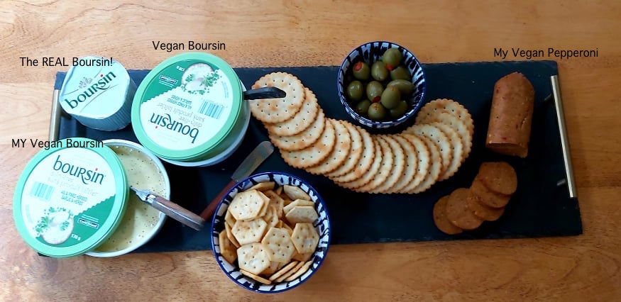 Appearance-wise, Bid and Paul knew immediately which of the two vegan Boursins was mine: mine is smoother and slightly yellow in colour and the surface is covered with small bubbles. The actual vegan Boursin is white and grainier in appearance as is the dairy Boursin.